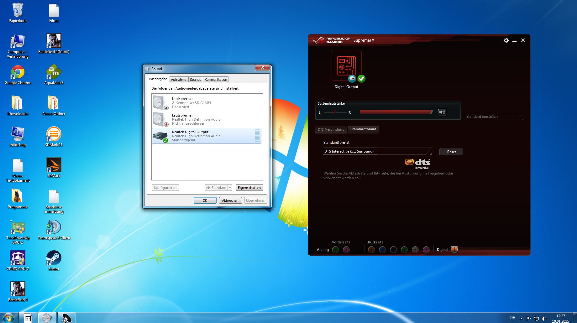 Moin Leute. Ich habe vor kurzem ein Neuen Pc gekauft. Und den gleich mal aus spaß an mein TV angeschlossen Via HDMI. Dazu aber ich das soundystem Logitech Z906 5.1 Lautsprechersystem THX und Dolby Digital. An mein Pc angeschlossen mit Optical anschluss. Aber es funktionoert kein 5.1 Bei z.b. Assassins Creed Black Flag und Daylight. Aber Battlefield 4 Funktioniert Bestens. Das Logitech Z906 5.1 Lautsprechersystem THX und Dolby Digital Funktioniert auch so Top wenn es über den Tv normal Lauft. Oder ein Film übern PC abschbield. Aber die Games da kommt nur Stereo? Warum. Mein Mainboard ist ASUS Maximus VII Hero. Falls gefragt wird wegen Soundkarte. Bitte um Hilfe. Und ja der aktuelle Treiber is drauf