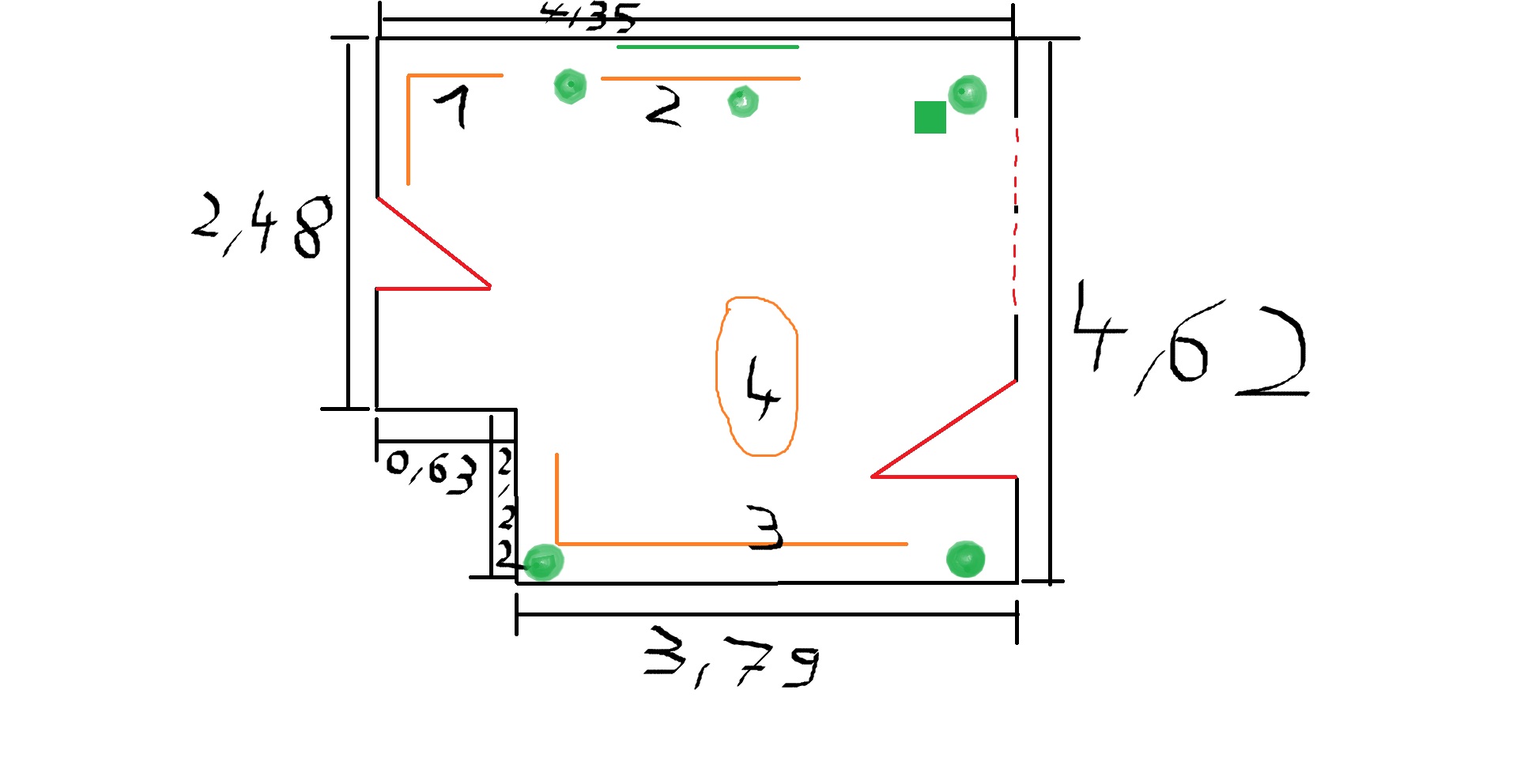 Die 3 orangenen Linien sind der Schreibtisch (1), das Sideboard (2), die Couch (3) und der Tisch (4).