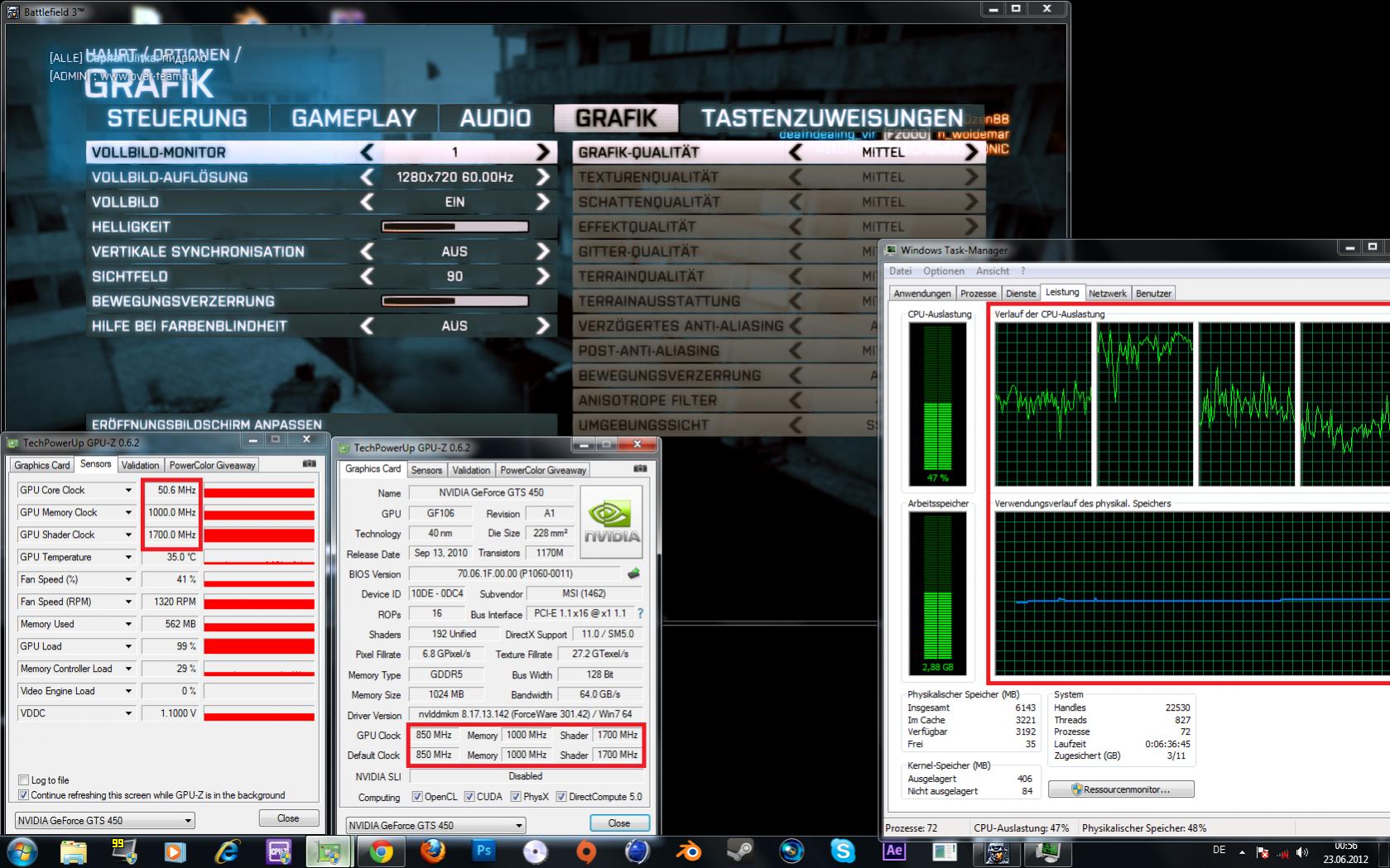 ich habe hier ein problem , denn meine GraKa ( CYCLONE GTS 450 1Gb GDDR5 ) leistet eindeutig zu wenig ( 50 Mhz GPU Clock siehe anhang ) bei Battlefield 3 und somit habe ich eine regelrechte Diashow in Battlefield 3 !!Ich weiß nicht woran das liegt und brauche eure Hilfe !!!