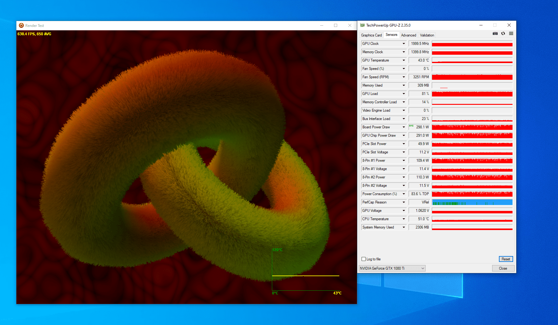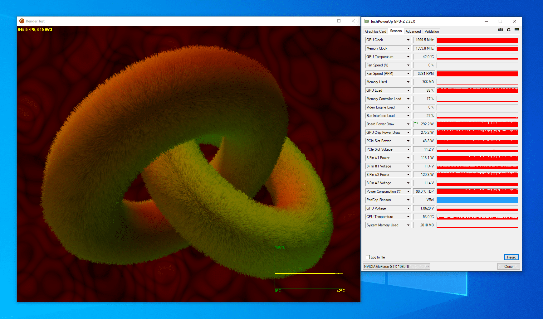 Dabei hat sie sich rund 292W genehmigt lt. GPU-Z über die 10 Minuten. Natürlich hatte ich da erst gewartet bis der Stresstest lief und erst dann die Messung mitlaufen lassen.