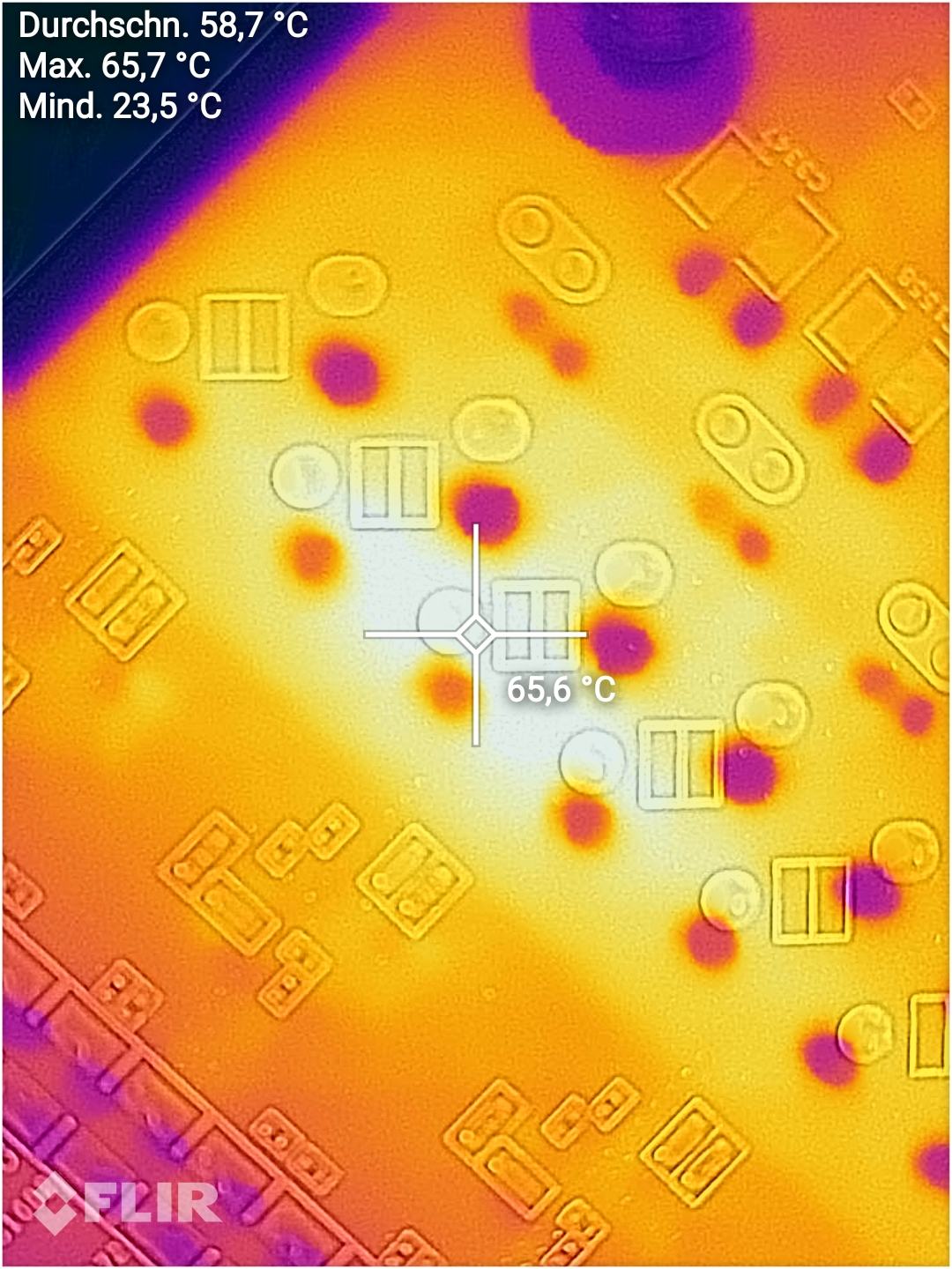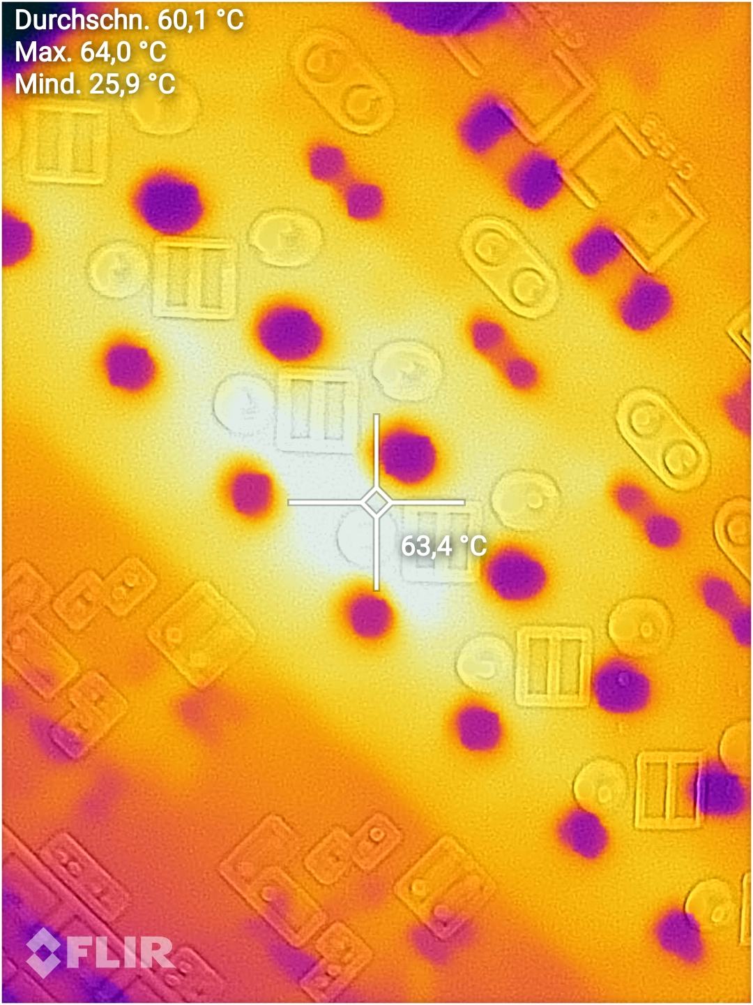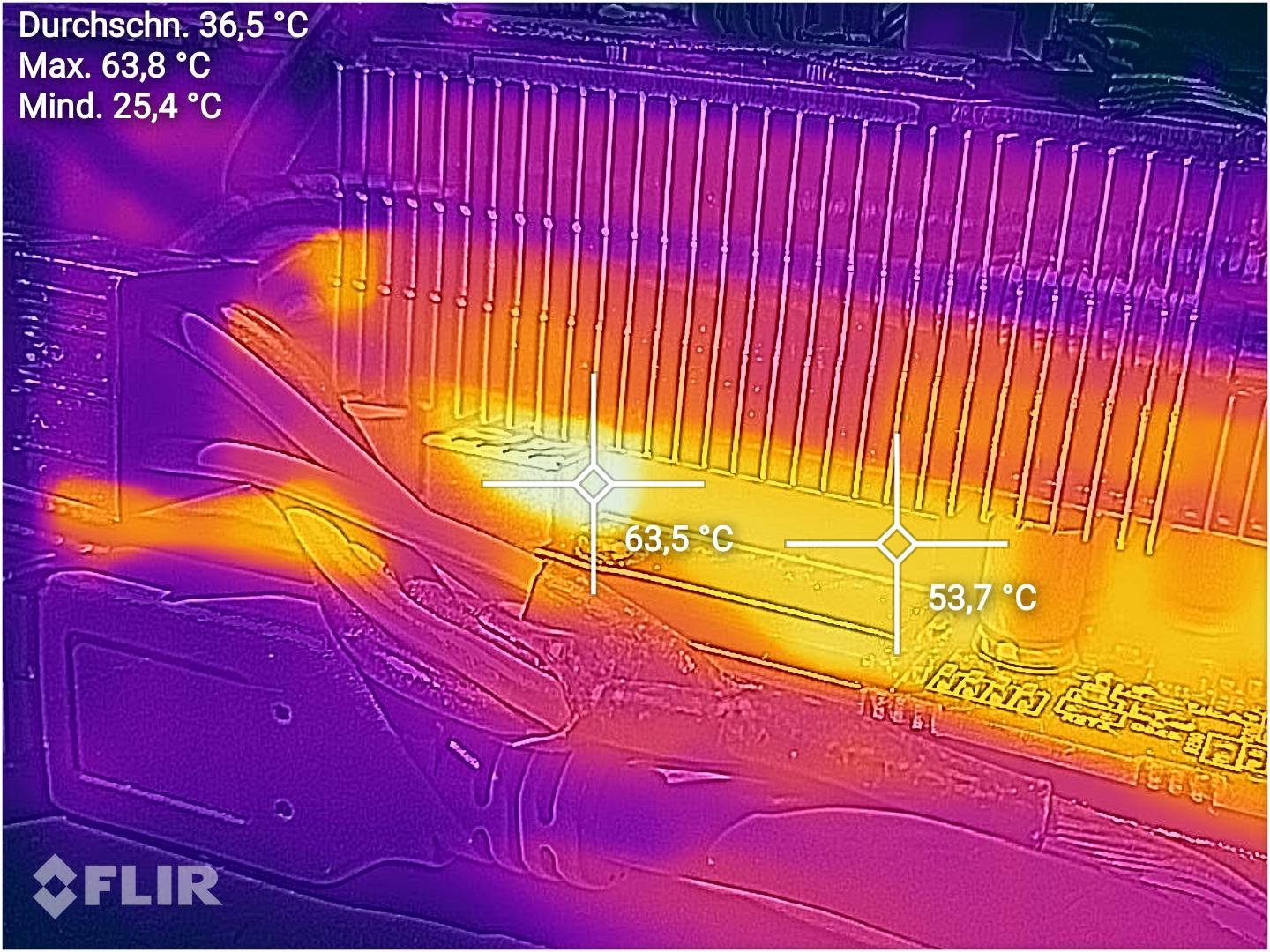 Die Spulen werden dabei rund 63°C Heiß - nicht vergessen bei dem Test läuft der Lüfter immer mit 100% (PWM Pin entfernt am Lüfteranschluss) um eben Messfehler durch eine Lüfterregelung auszuschließen.