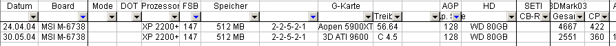 Edit: würde aber KRambo in soweit zustimmen, daß Benchmarks nur bedingt geeignet sind um verschiedene Rechner zu vergleichen. Hingegen können Sie aber gute Hinweise sein, wie sich Dein System bei verschiedenen Einstellungen verhält, stell zB die AGP Aparture Size einmal auf 64 MB und mal auf 128 MB, lass jeweils den 3DMArk laufen. Bei meinen Rechenknecht messe Ich einmal 5207 (mit 64 MB) und einmal 5565 (mit 128 MB), ansonsten gleiche Einstellungen.