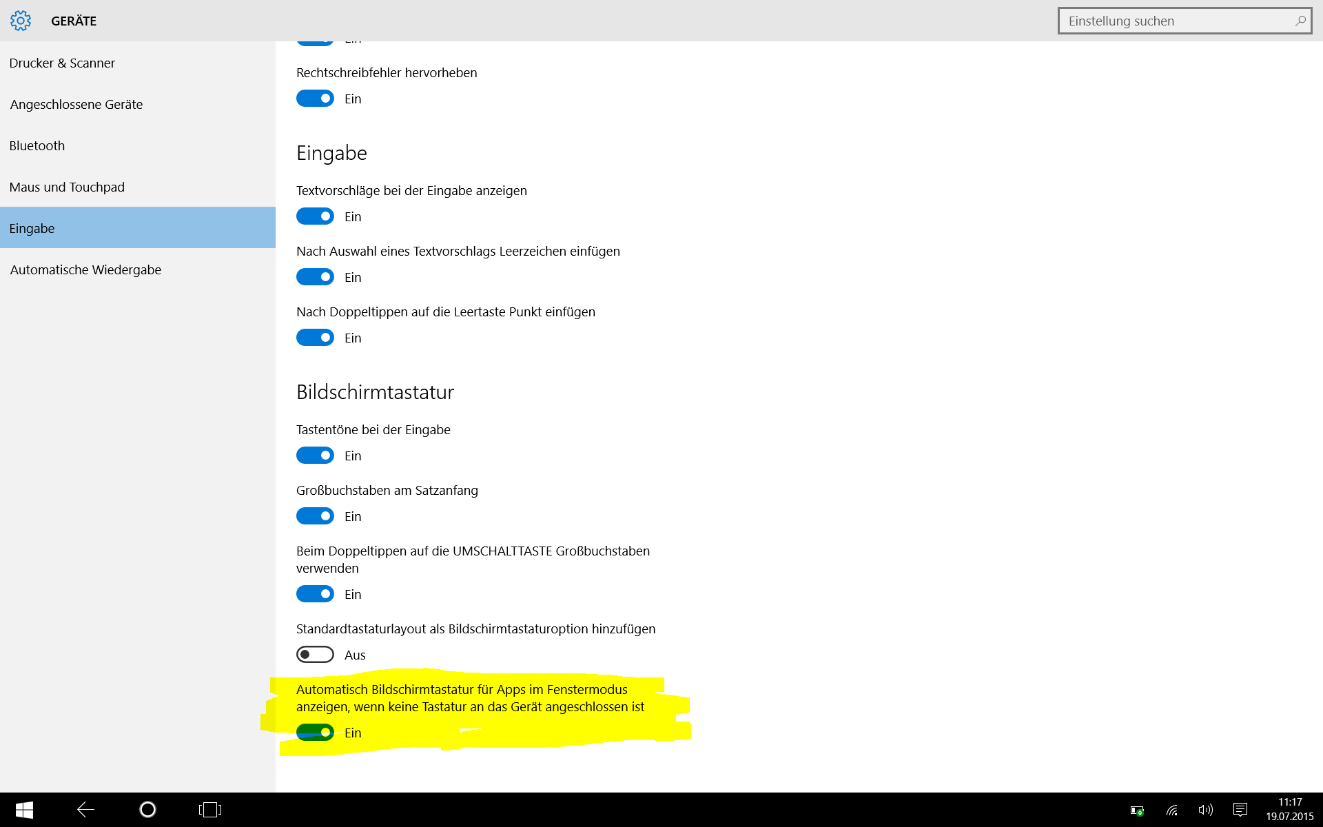 Wenn ich auf dem Kachelbildschirm die Store-App öffne und dann ins Suchfeld ('Nach Apps suchen') tippe öffnet sich automatisch das Tastaturfeld (egal ob das Tablet mit oder ohne Tastaturpad betrieben wird) und das Tastaturfeld schließt automatisch wenn ich im Tastaturfeld auf 'Suchen' tippe...