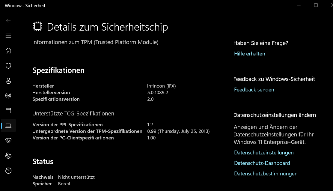 Ich habe durch Zufall festgestellt, dass in der Windows Sicherheit unter Gerätesicherheit - Details zum Sicherheitschip bei Status Nachweis „Nicht unterstützt“ angezeigt wird. Gleichzeitig steht jedoch bei Speicher „bereit“. Auch die Spezifikation für den Sicherheitschip werden alle korrekt angezeigt. Klicke ich auf die Problembehandlung für Sicherheitschip wird in einer Fehlermeldung behauptet: