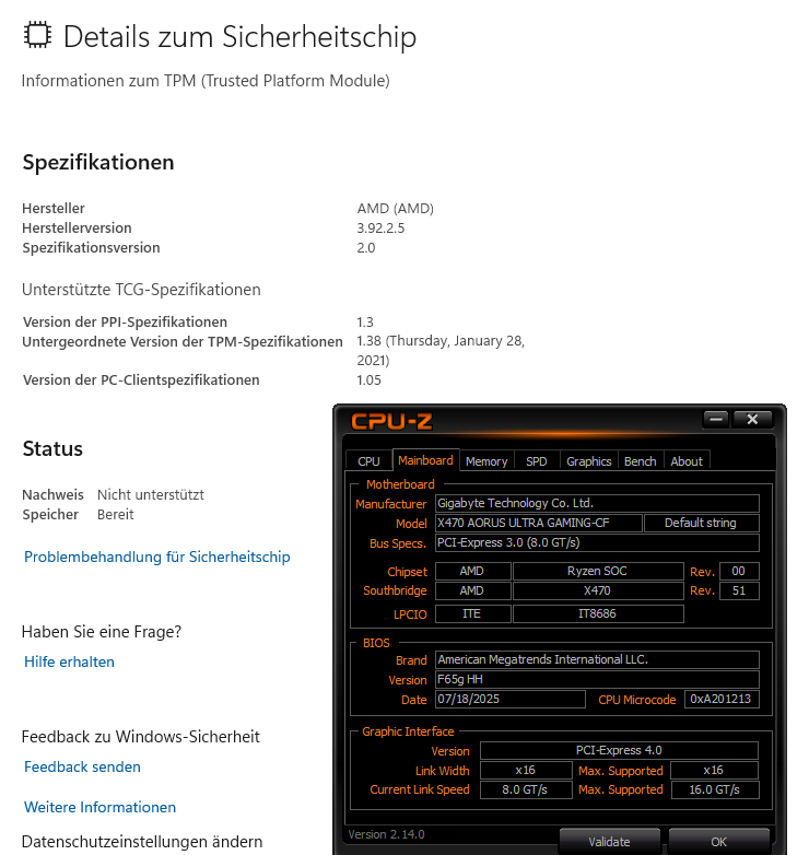 Ich habe durch Zufall festgestellt, dass in der Windows Sicherheit unter Gerätesicherheit - Details zum Sicherheitschip bei Status Nachweis „Nicht unterstützt“ angezeigt wird. Gleichzeitig steht jedoch bei Speicher „bereit“. Auch die Spezifikation für den Sicherheitschip werden alle korrekt angezeigt. Klicke ich auf die Problembehandlung für Sicherheitschip wird in einer Fehlermeldung behauptet: