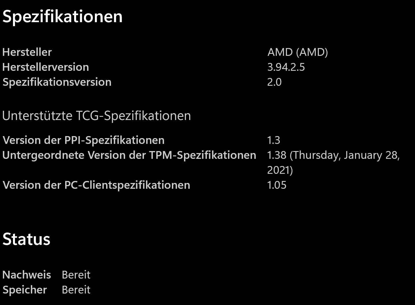 Ich habe auch schon tpm.msc ausgeführt. Hier sieht auch alles gut aus. Der TPM Status ist einsatzbereit und auch die Spezifikationen werden angezeigt.