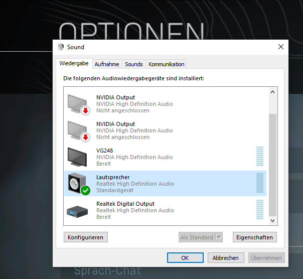 Meine Settings sind eigentlich alle richtig eingestellt, auch wenn ich probeweise den Sprachchat deaktiviere und wieder aktiviere, höre ich die Spieler trotzdem nicht. Auch wenn ich die Spieler einzel mute oder entmute, passiert nichts.