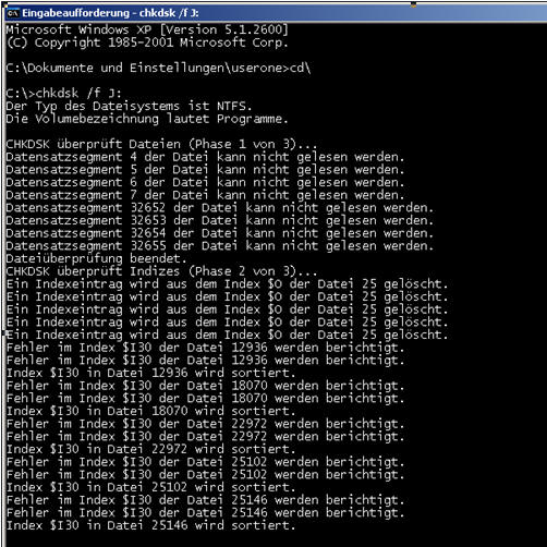 Ich habe 2 FP in meinem PC (AMD 3200+) mit 2 GB Speicher und BS Win XP Pro. So nun hatte ich u. a. auch das Tool "HDD Health" im Hintergrund laufen, das mir vor einigen Tagen mitteilte, dass die 2. FP (SP 120 ...) nur noch 1% hätte (Gesundheitszustand). Es wollte ich diverse Dateien auf meine 1. FP (Hauptplatte mit BS) sichern. Habe aber nun das Problem, dass diverse Dateien bzw. Ordner nicht mehr vorhanden sind. Deswegen wollte ich diese Partition überprüfen und bekam folgende Meldung. Und bevor ich etwas falsch mache, wollte ich hier mal nachfragen, was diese Meldung bedeutet und wie die Auswirkungen wären, wenn ich hier mit "J" quittieren würde.