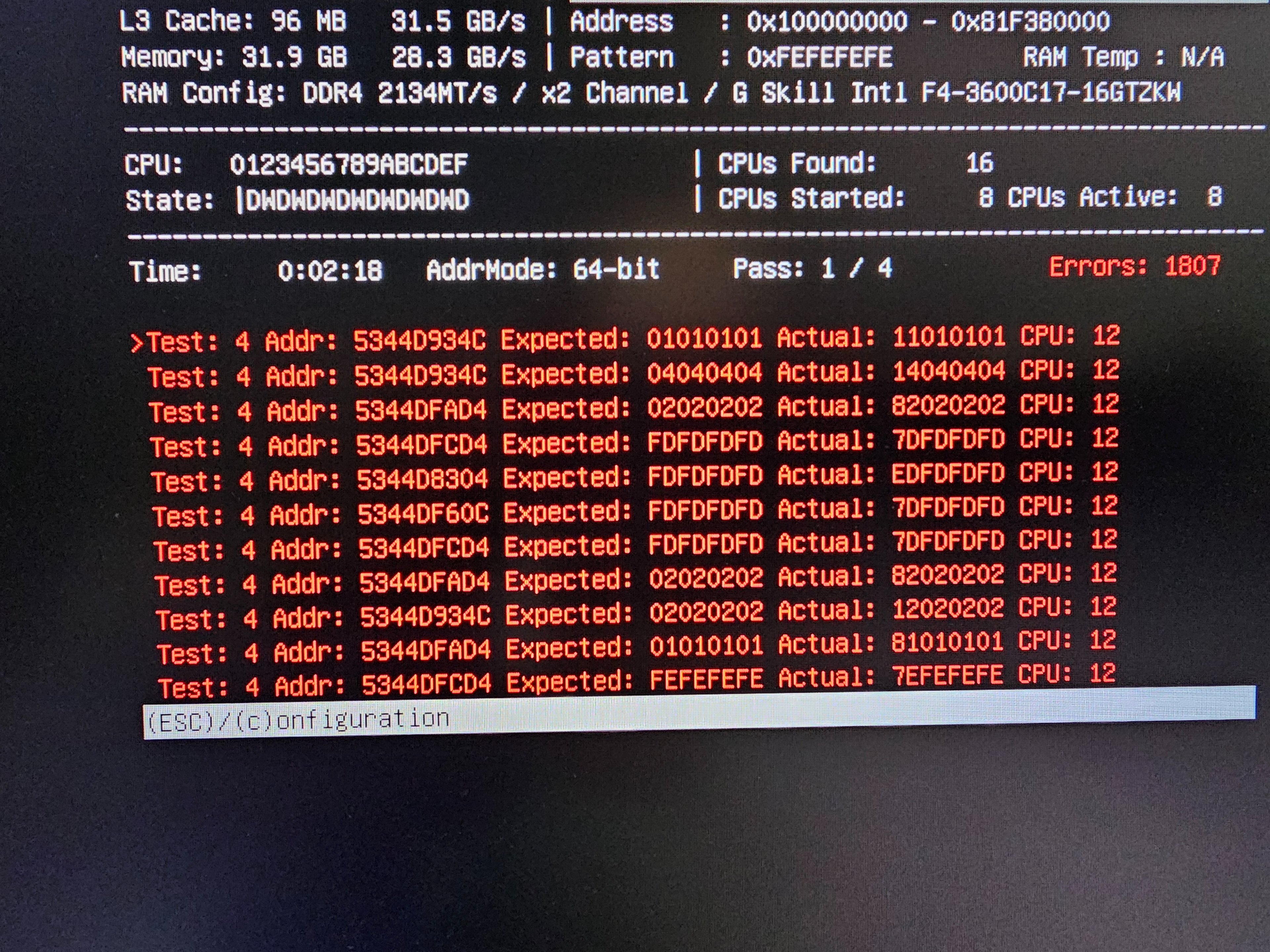 Habe jetzt den Memtest86 ausgeführt und sofort nach Start dutzende Fehler erhalten, am. Ende standen nach dem ersten Durchlauf über 6k Fehler da.
