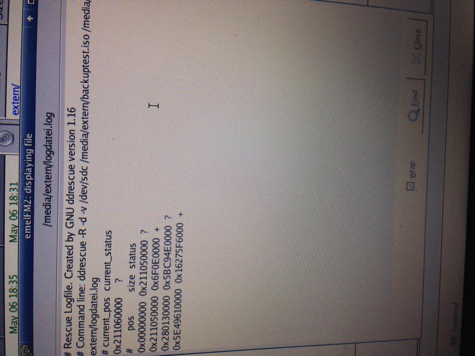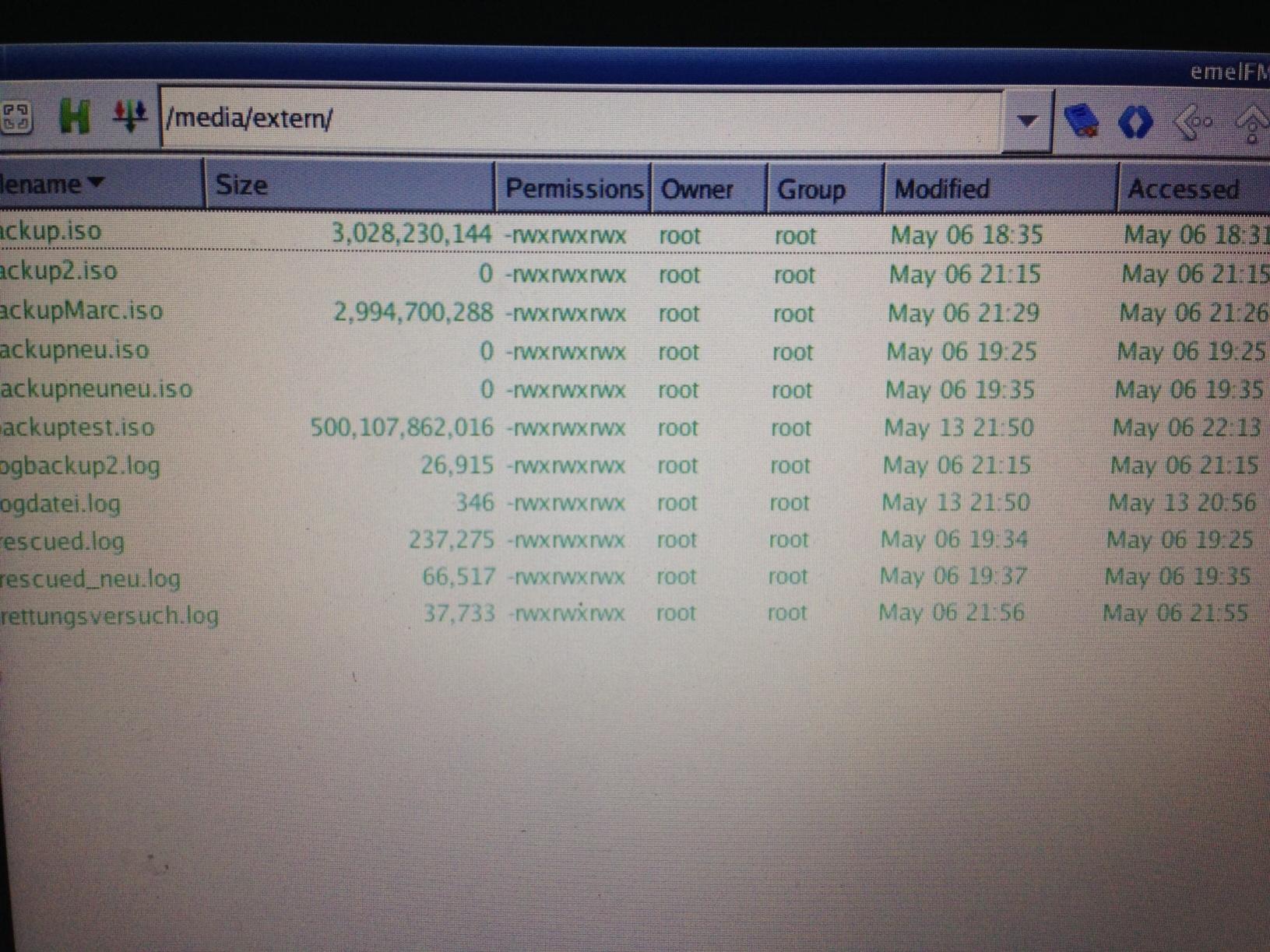 Ich glaube irgendwas funktioniert nicht. Seit gestern hat sich die Größe der iso-Datei nicht mehr geändert (das ist im Foto die backuptest.iso), obwohl rescued ca. 1,5 GB mehr geworden ist (liegt das vielleicht am -d im Befehl?)