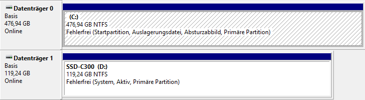 Mein C: ist als Startpartition markiert, mein D: (Spiele) als Systempartition und gerade keine als aktiv. Da ich die aktive Platte nicht angeschlossen habe. Der Computer würde sonst mit dem Fehler "NTLDR fehlt" das Booten verweigern.