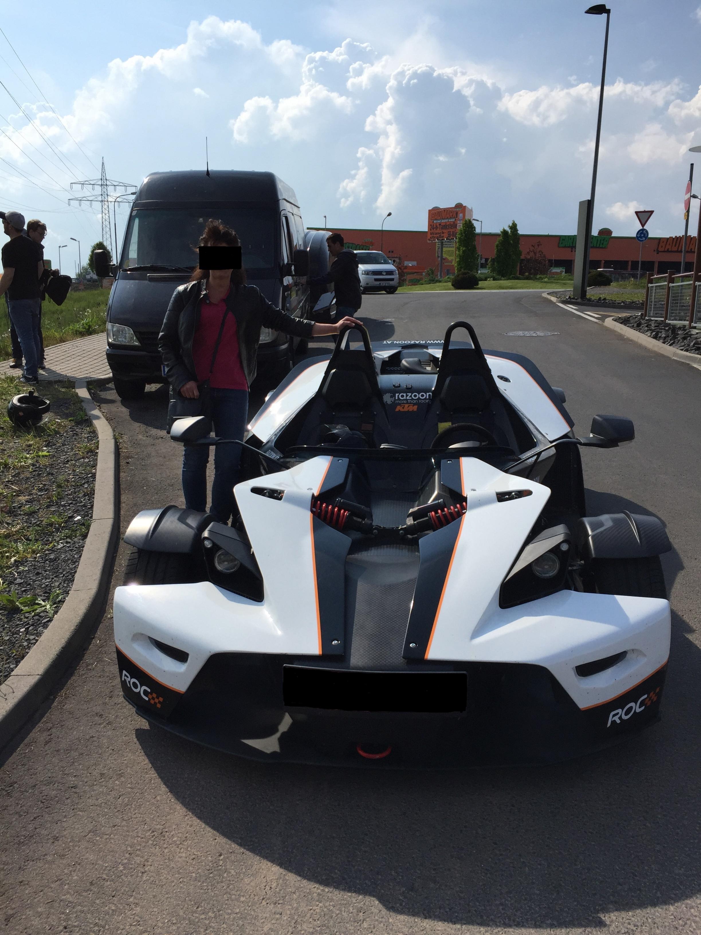 Das kleine Geschoss nennt sich KTM X-Bow. Wir haben eine leicht umgebaute Rennversion mit Rennfahrwerk (Gut für Zahnärzte und Orthopäden!), Brembo Rennbremsanlage (Unglaubliche Verzögerung! Ich hatte danach Angst, dass mein Auto beim Bremsen nicht zum Stillstand kommt!), Rennauspuffanlage und einem Audi 2.0l TFSI 4 Zylinder Turbo mit 300PS und 440 Nm im Heck. Normalerweise hat er auch einen großen Heckspoiler, der allerdings auf der Straße gegen einen kleinen Spoiler getauscht wird. Das Ganze verteilt sich dann auf 741kg Leergewicht. Was das für die Beschleunigung und den Durchzug bedeutet, muss ich wohl nicht explizit erwähnen!