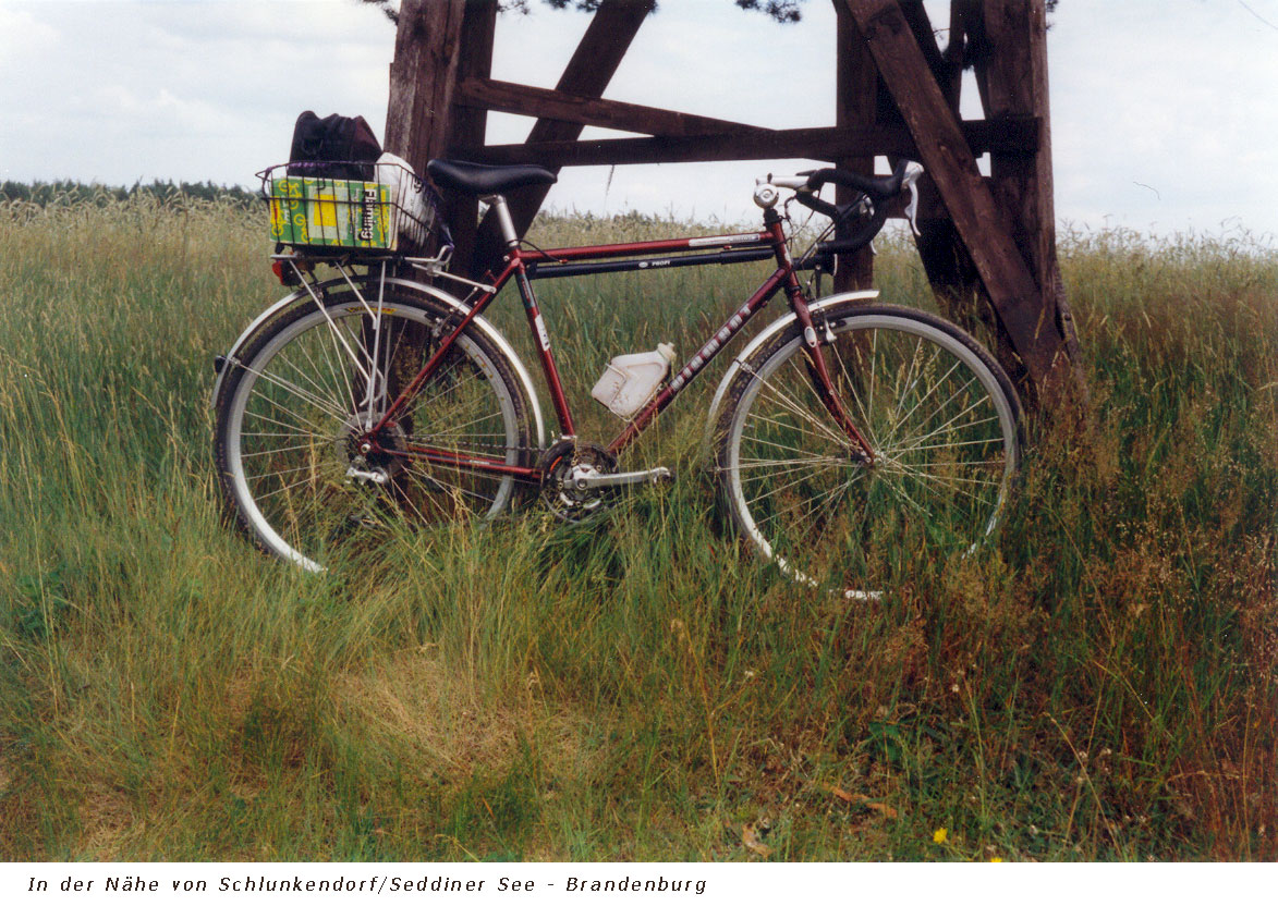 Das Rad. Das erste Bild ist drei Jahre alt, und so sieht es auch heute noch aus, nach 24 Jahren. Die anderen Bilder sind von Radtouren in Brandenburg. Das heißt, die Bilder zeigen eine meiner Ansicht nach der schönsten Touren in Brandenburg: Mit dem Zug bis nach Belzig - Festung Belzig - Borner Mühle - Burg Rabenstein - und zurück bis zum S-Bahnhof Griebnitzsee. Landschaftlich schöne Strecke. Etwa 100 bis 110 Kilometer.