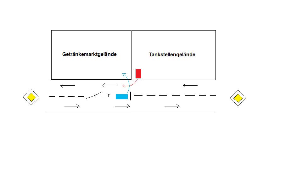Wäre also die Frage, kann Rot aus der Ausfahrt auf die Fahrbahn fahren ohne dabei schon Blau zu behindern?