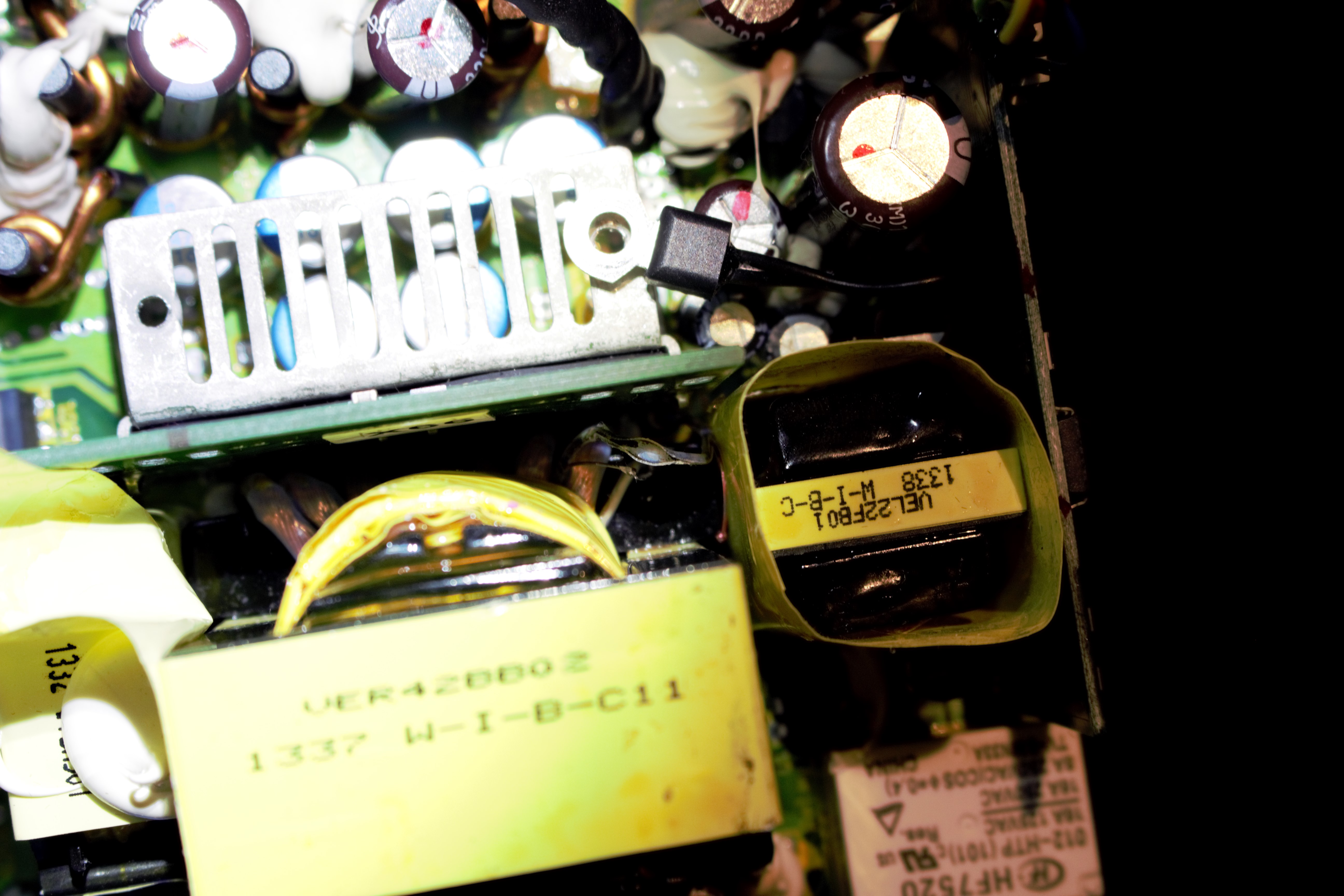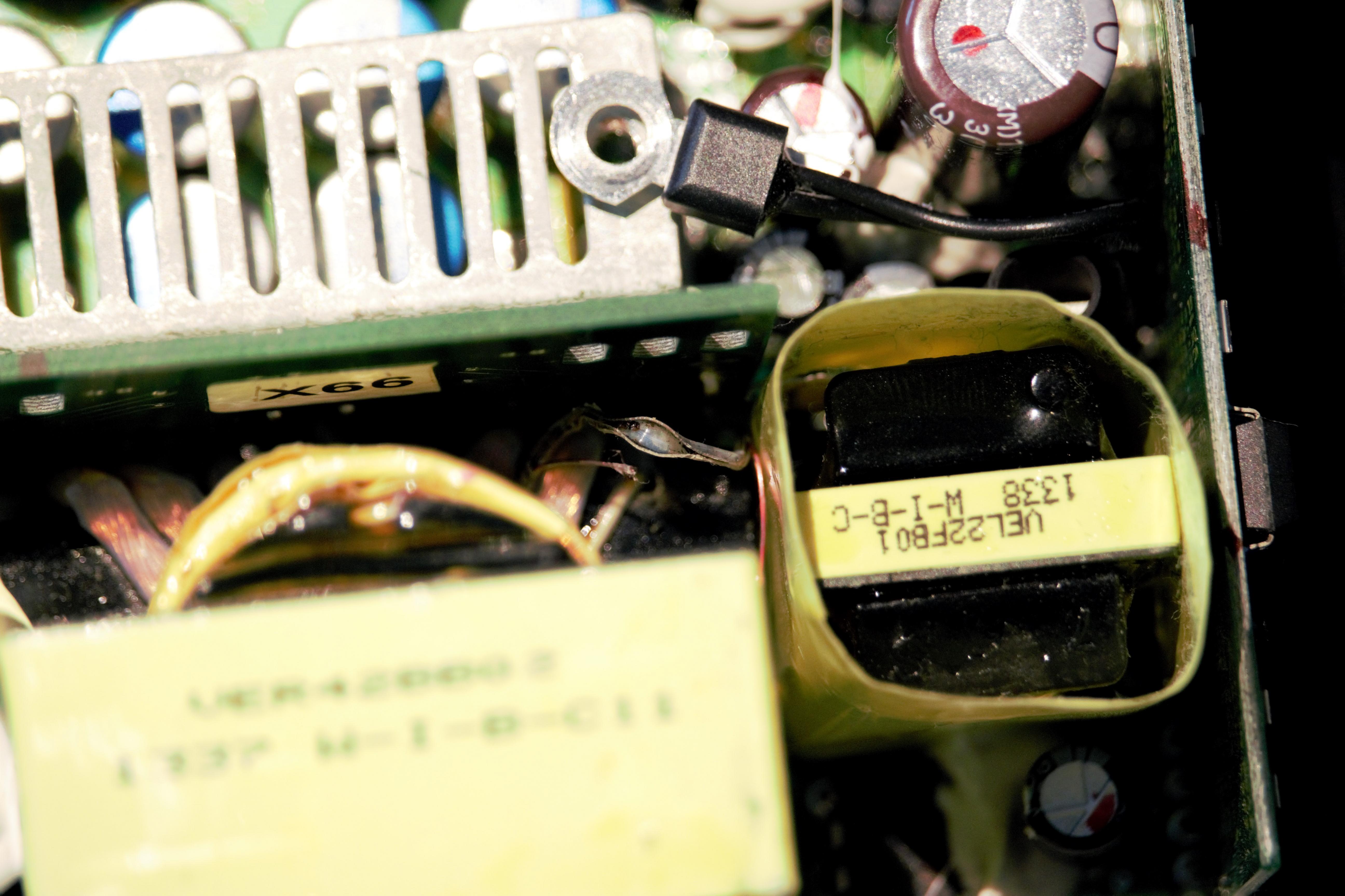 Das Netzteil hat sich nach dem Einschalten ca 1/2 Sekunde später wieder selbst abgeschaltet, reproduzierbar. Kurz vor dem ersten defekt ist mir ein recht verschmorter Geruch aufgefallen. Also habe ich das Netzteil zerlegt und etwas Interessantes entdeckt. Ein sehr dünnes Kabel das von der großen Spule (mitte) direkt auf die Platine gelötet ist ist offenbar durch"geschmort". Dafür habe ich die Bilder angehängt. Ich hoffe man kann etwas erkennen, es war nicht einfach diese filigranen Stellen abzulichten.