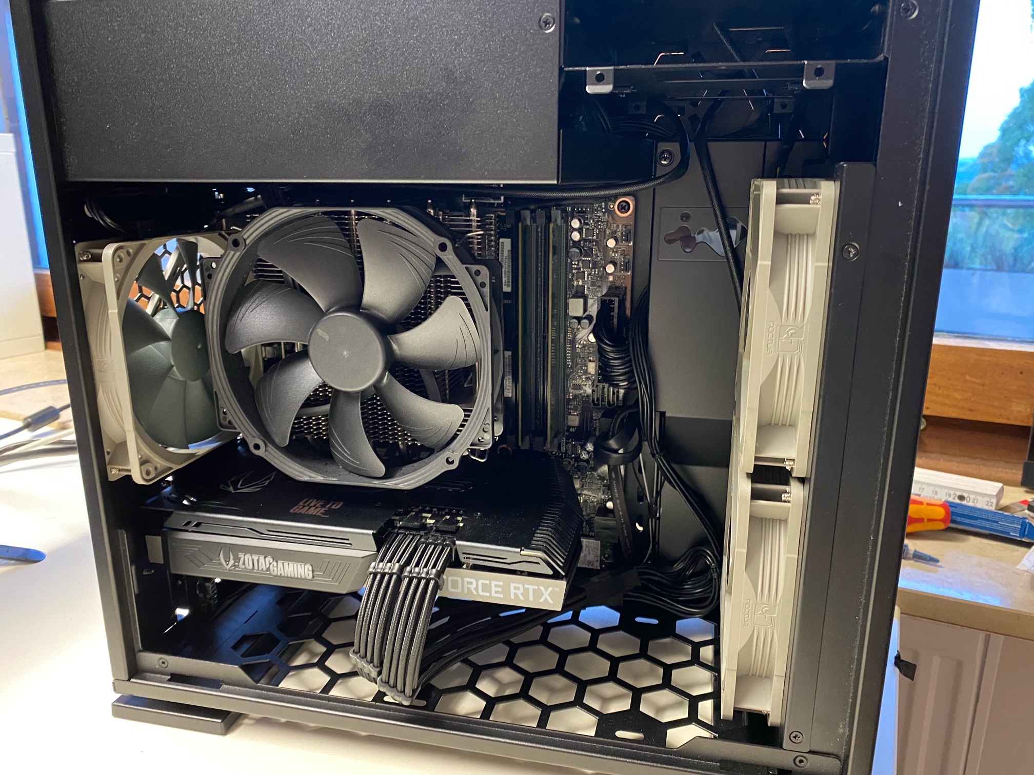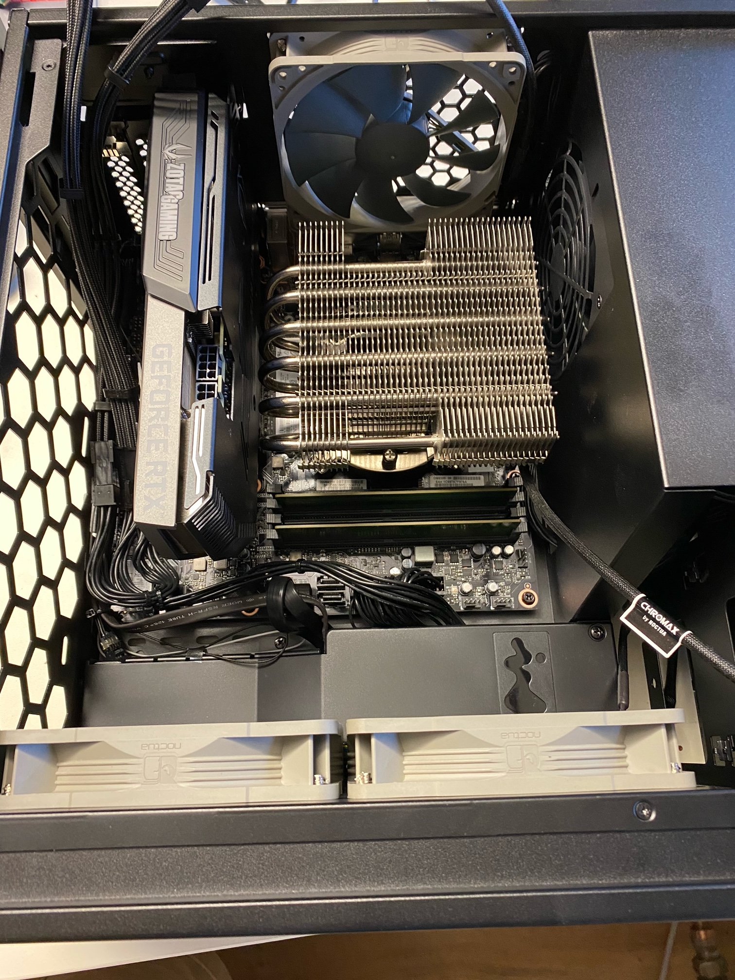 Aus dem "alten" Setup werde ich meinen Noctua NH-C12P verbauen und die zwei Acryl-Gehäuselüfter durch 3 anständige 120mm-Lüfter austauschen. Mit dem deutlich größeren Top Blower erhoffe ich mir noch zusätzliche Kühlung in Richtung MB-Komponenten --> SSD, RAM, VRMs etc.