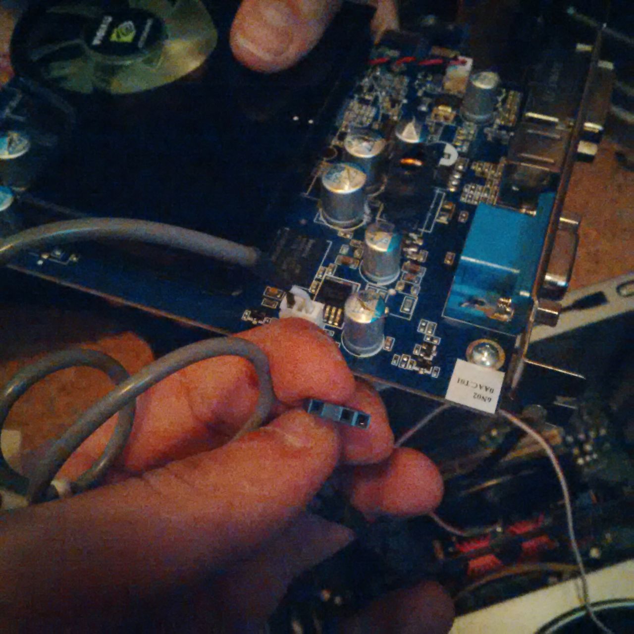 Hmm, sieht für mich nach 2Pin aus, da würde ich mal auf den Anschluss des Lüfters tippen. Einige Grakas haben auch einen 2 Pin Header für Audio. (Aus der Soundkarte zum Einschleifen in den HDMI Ausgang, das hatte eine meine Grakas.)