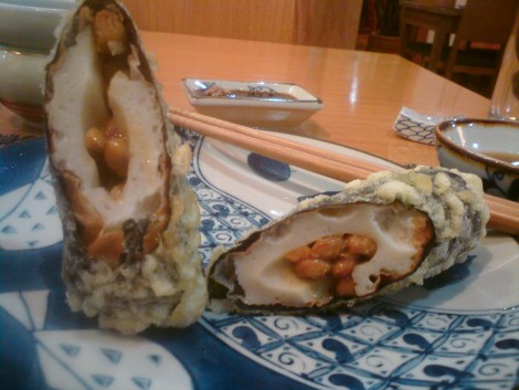 Das Zeug mit dem die Bohne umwickelt sind ist das hier. Schmeckt aber nei weitem nicht wie Fisch, aber ist nicht eklisch. ) http://de.wikipedia.org/wiki/Surimi