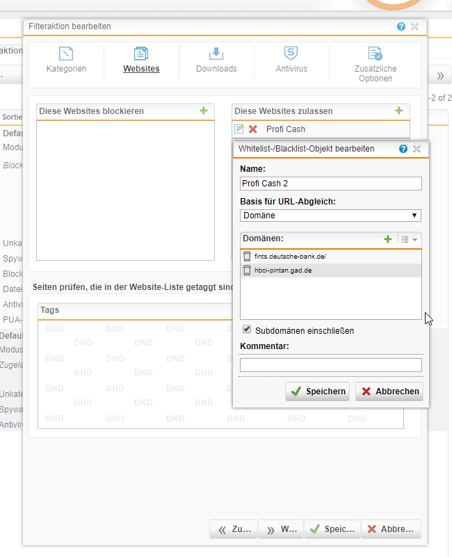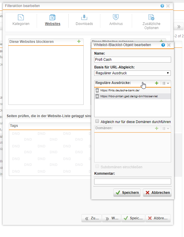 Wie gehabt ist domain.de immer und überall freigegeben, egal was sonst geblockt wird. Anders als im oberen Beispiel wird werbung.domain.de nun aber immer geblockt, egal was sonst erlaubt ist. Selbst eine pauschale Freigabe für Port 80 würde hier also nicht greifen, da die Blacklist prinzipiell immer alles blockt.
