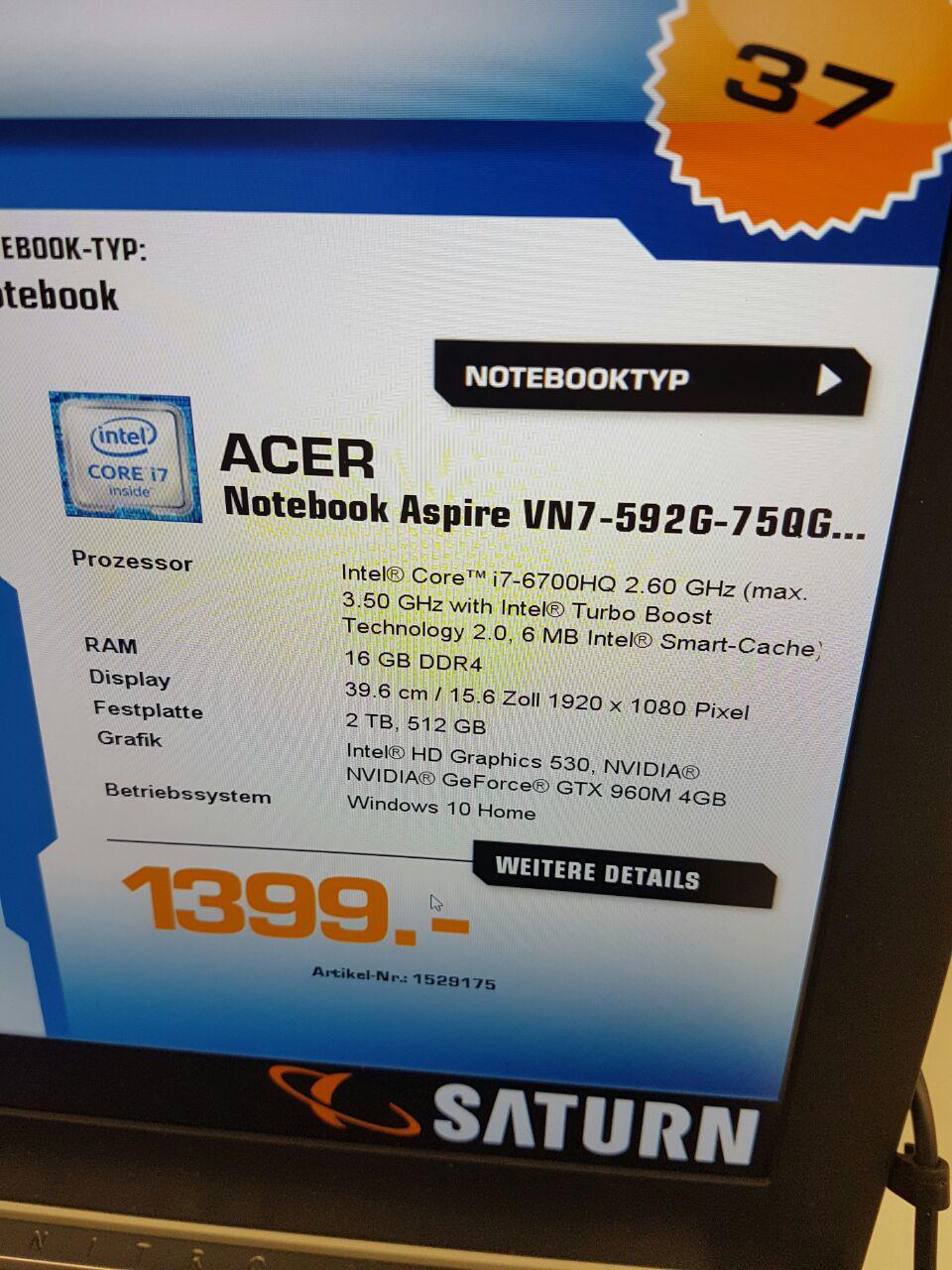 Im Fachhandel habe ich gestern den Acer Aspire VN7-592G-75QG gesehen, das mir dort (no, na net, aber der Verkäufer klang für mich sehr kompetent) als hervorragend beschrieben wurde und mir das letzte Exemplar reserviert. Laut Auskunft des Verkäufers wird das Nachfolgermodell bald erscheinen (lohnt es sich, auf die nächste Generation zu warten?).
