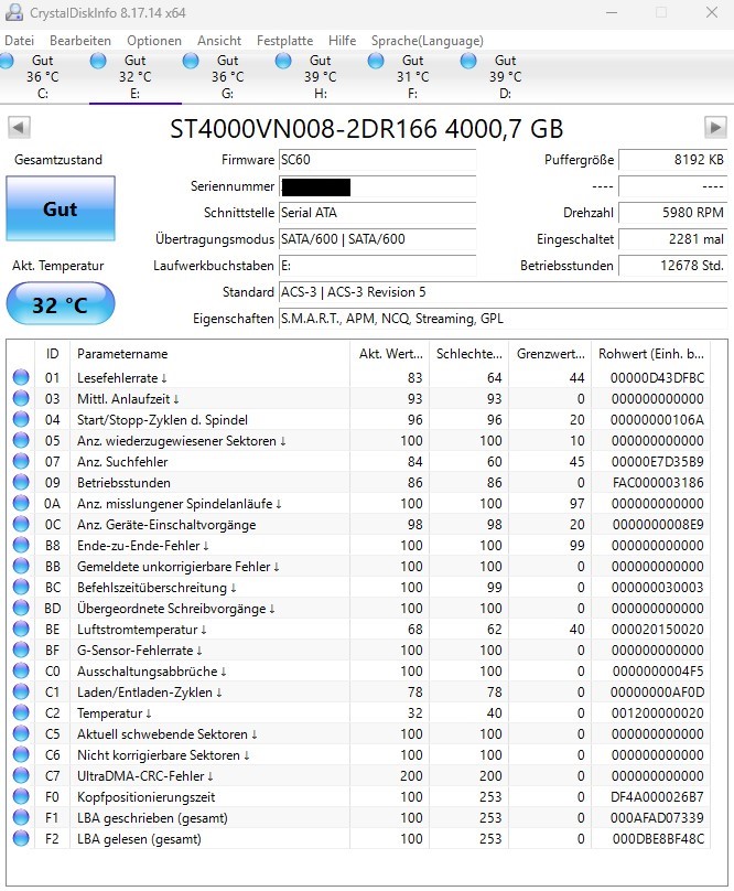 Handelt sich bei mir um eine Seagate Ironwolf 4TB und eine WD Red 4TB, die ich jetzt leider von einer waagerechten Lage in eine senkrechte Lage bringen musste. Grund: Neuer PC. Fractal R6 musste wegen der Wasserkühlung in Open Layout umgebaut werden...jetzt kaum noch Platz für HDDs. Die zwei kamen jetzt an die Seitenwand. Die anderen beiden befinden sich noch außerhalb des PCs lol...werde ich bald vorne, unten reinlegen müssen (in einem Phanteks Cage)!