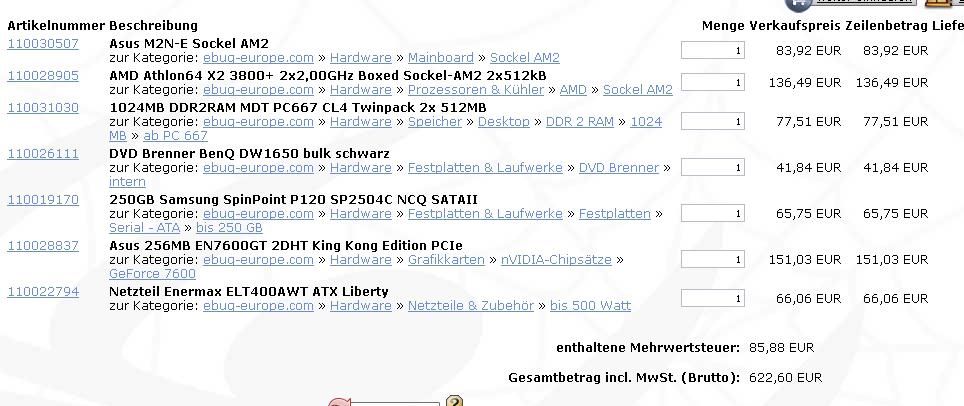 Wie schon gesagt, ein Conroe-System würde mich schon sehr reizen. Bei deiner Zusammenstelleung fehlen aber noch die Festplatten, der DVD-Brenner und Gehäuse.