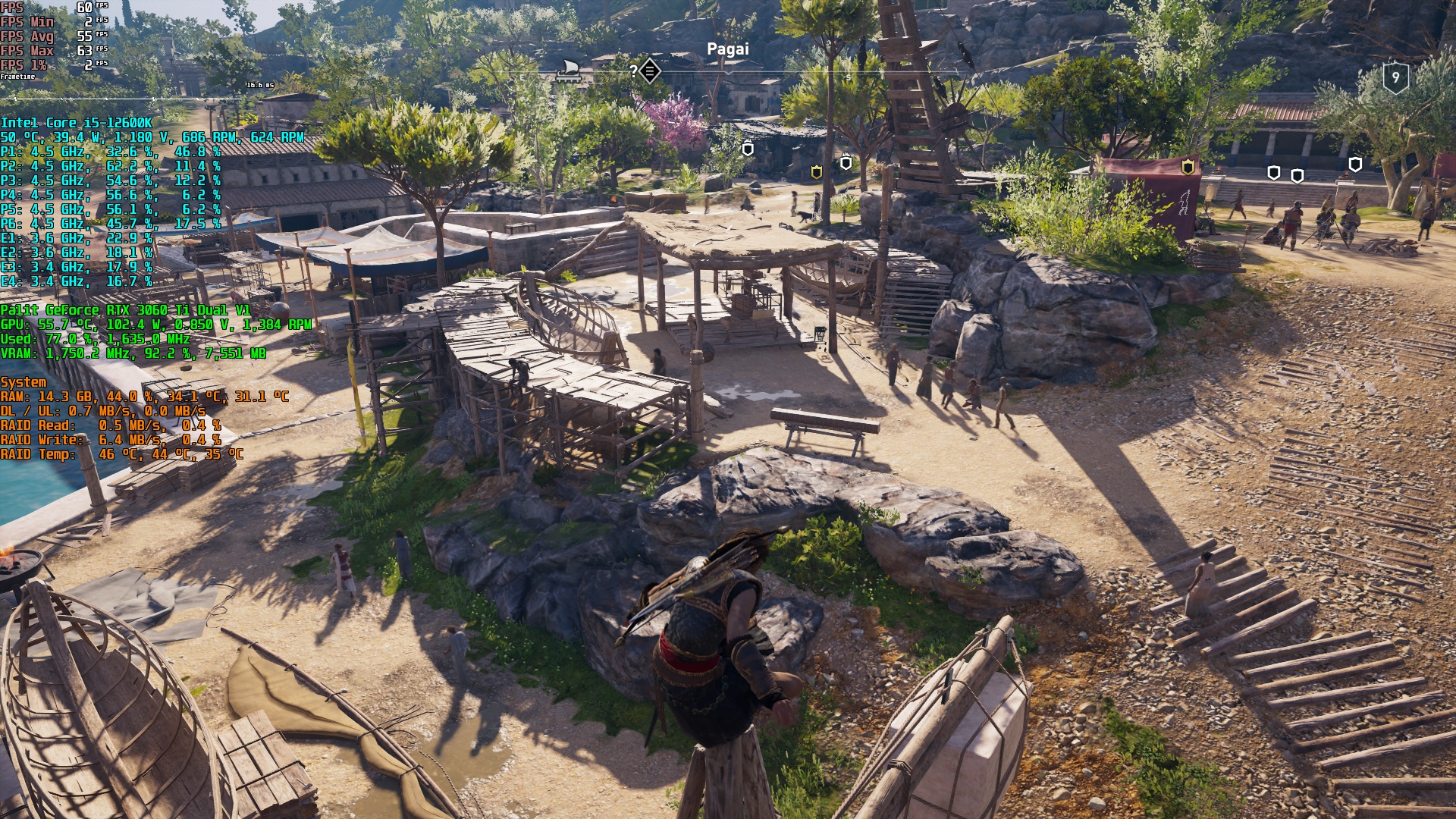 In der Telemetrie schön zu sehen: Grafikkarte (RTX 3060 Ti) etwa zur Hälfte ausgelastet -> hier nicht von den % irritieren lassen. Die 77% Auslastung kommen daher Zustande, weil der Core Clock der GPU nicht auf Maximum läuft. Das machen die Grafikkarten mittlerweile ja sehr geschickt: der Core Clock wird heruntergetaktet, wenn keine volle Leistung benötigt wird, dadurch sinkt die notwendige VCore und dadurch wiederum der gesamte Strombedarf. Gemessen an der "Gesamtleistung" also von ca. 200 Watt, die die Karte aufnehmen kann, liegen hier ca. 50% an (~103 Watt). Im Verhältnis zum Core Clock hingegen von "nur" 1635 MHz wären es wiederum 77% der Grafikkartenleistung. Meine Karte boostet in Einzelfällen bis über 1925 MHz werksseitig. von daher passt das ganz gut.