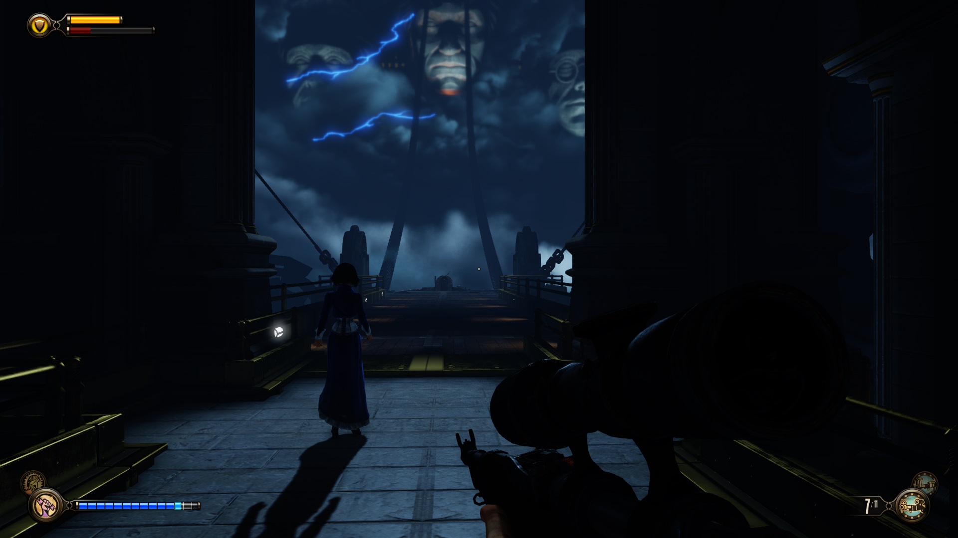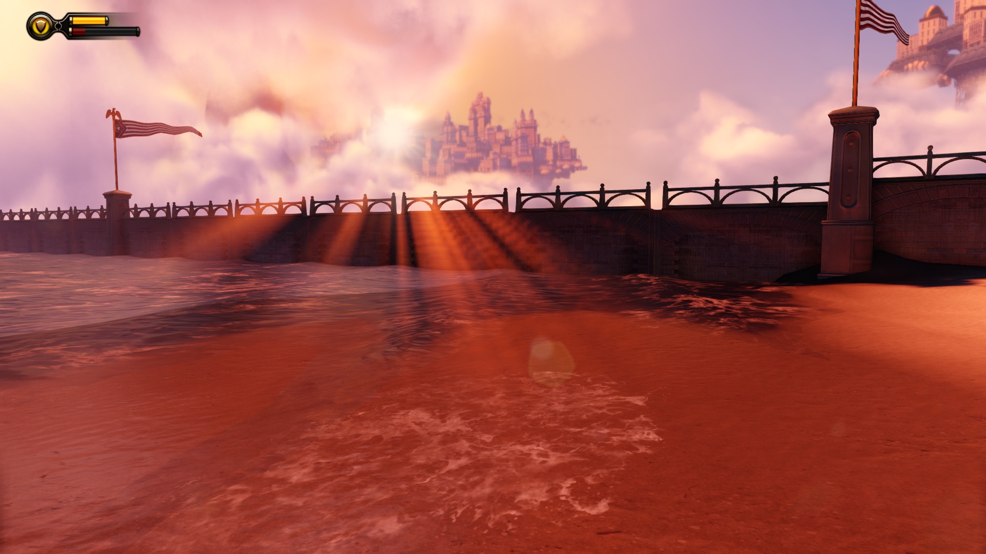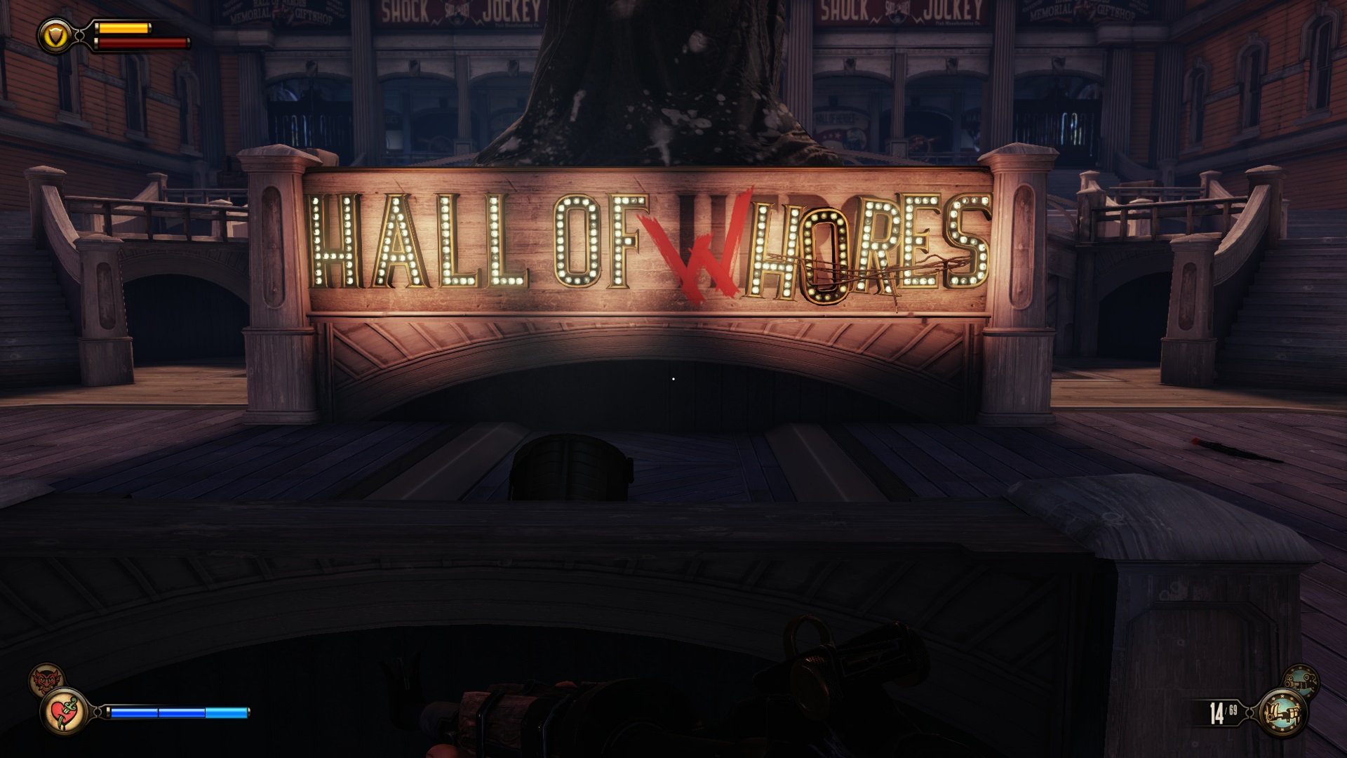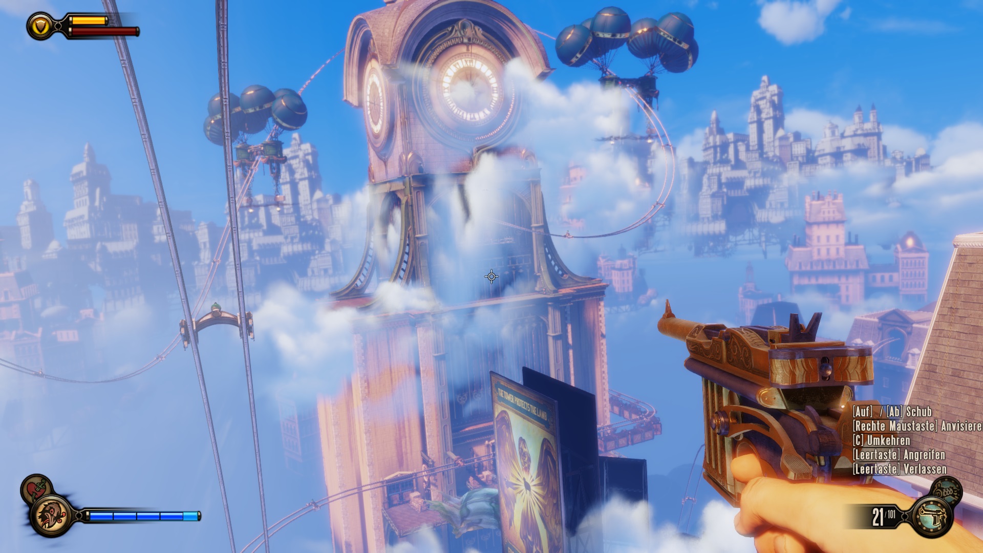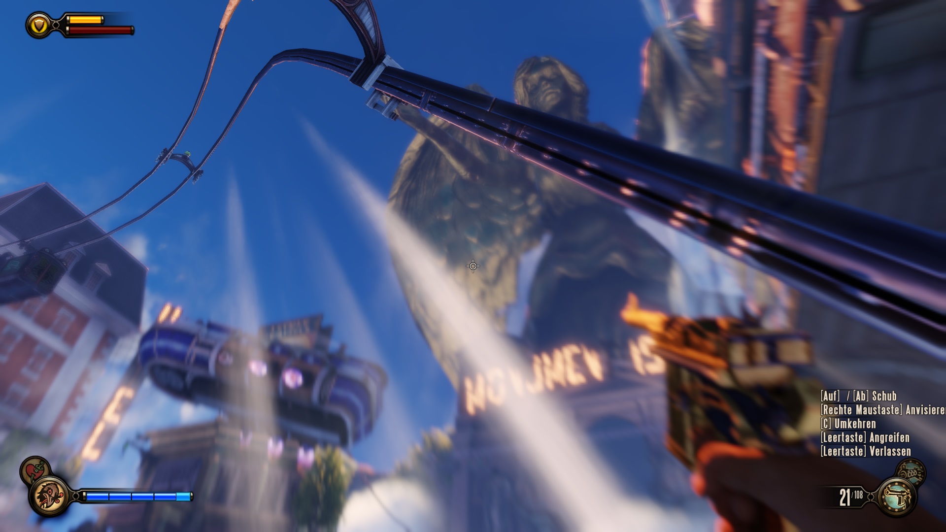 und um dann auch mal wieder den bildauftrag zu erfüllen nachdem auf dieser seite bisher nur gelabert wurde (hust): vorletzten freitag hatte ich mir BioShock Infinite im sale gekauft nachdem ich immer wieder mal (sehr) gutes über das game gehört hatte. samstag vormittag dann mal reingeschaut... und 10 stunden am stück gezockt. sonntag dann nochmal knapp 10. hauptspiel wurde im letzten drittel zunehmend verwirrend und das ende gefiel mir nicht sonderlich, unterm strich hatte ich aber durchaus spaß. der story-DLC dagegen... ich wünschte ich hätte den nicht gespielt, der hat mich doch einigermaßen verstört und deprimiert. genug gelabert, endlich bilder:
