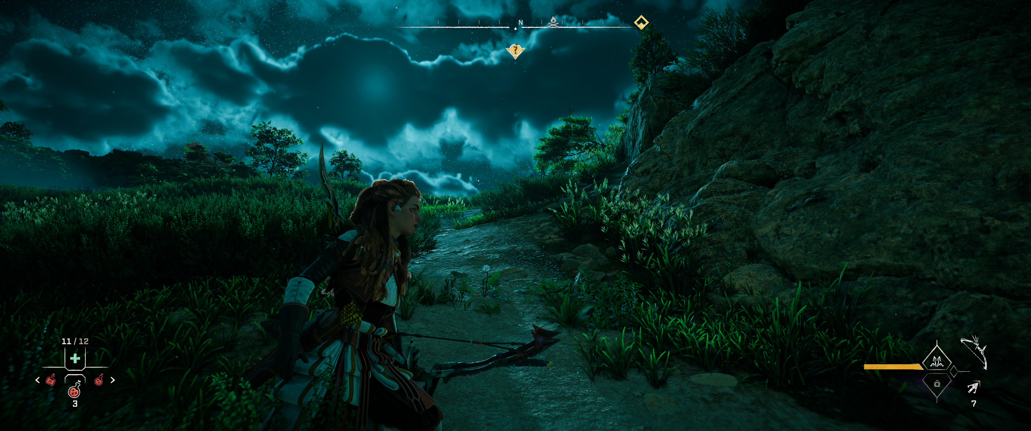 Da es jetzt auch Tag-Nacht-Zyklus nach dem AbschlieĂen des durchaus schon sehr umfangreichen Prologs gibt, muss ich sagen: auch im Mondschein sieht die Welt (und Aloy) weiterhin wunderschön aus!