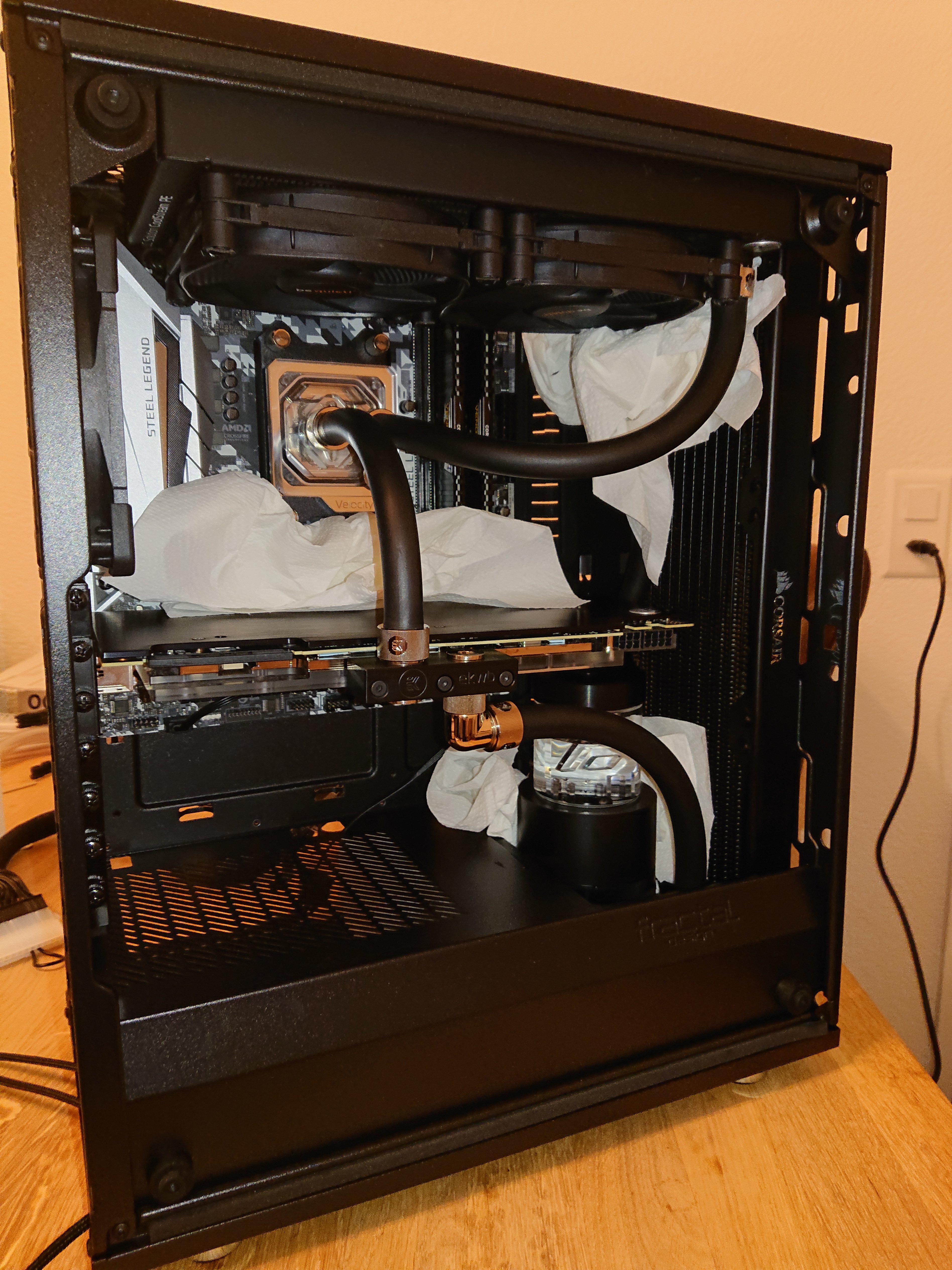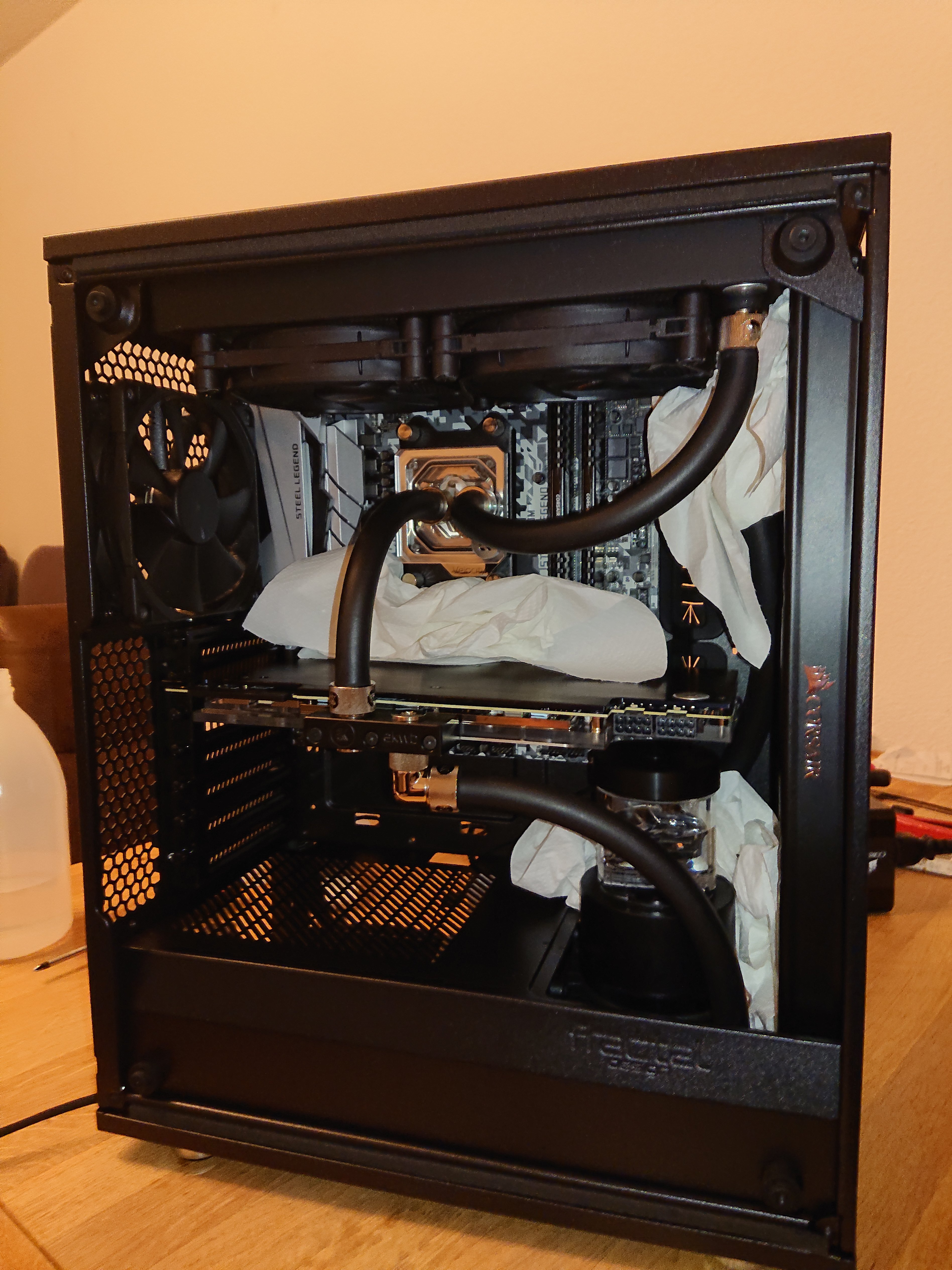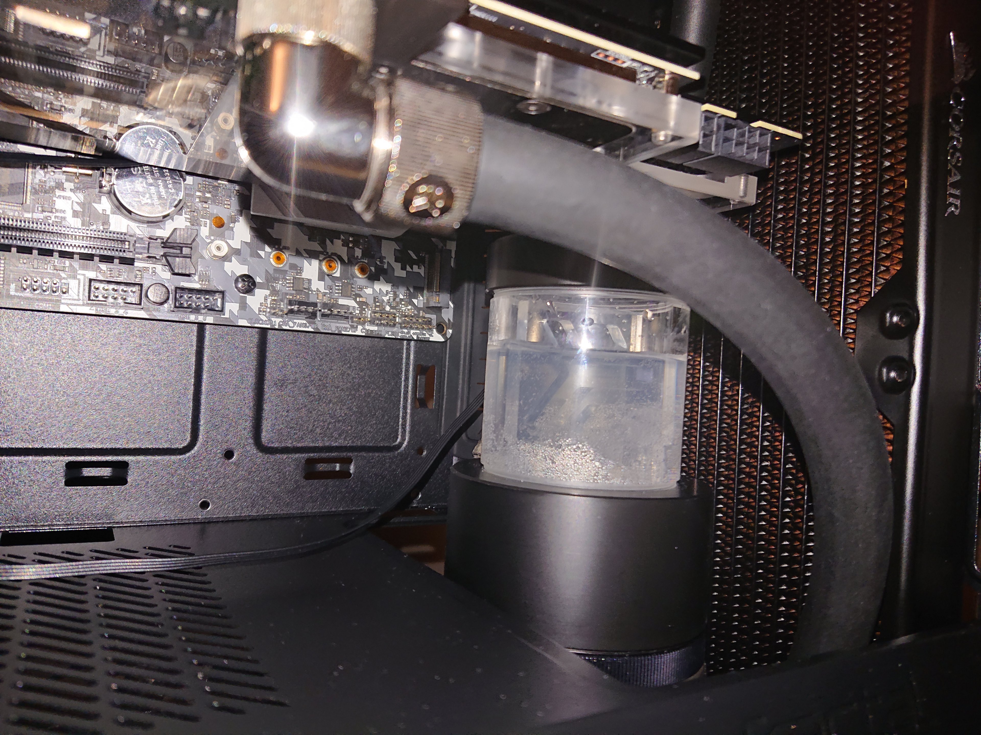 Da ich beim alten Build Probleme mit Ablagerungen hatte, habe ich beim neuen Loop EK ZMT Schlauch verwendet. Ausserdem ist der Corsair XR5 neu. Dieser wurde natürlich vor dem Einbau gründlich gespült. genauso wie alle anderen Komponenten einzeln mit der Pumpe und destilliertem Wasser gespült wurden, bis kein Dreck mehr sichtbar war / heraus kam.