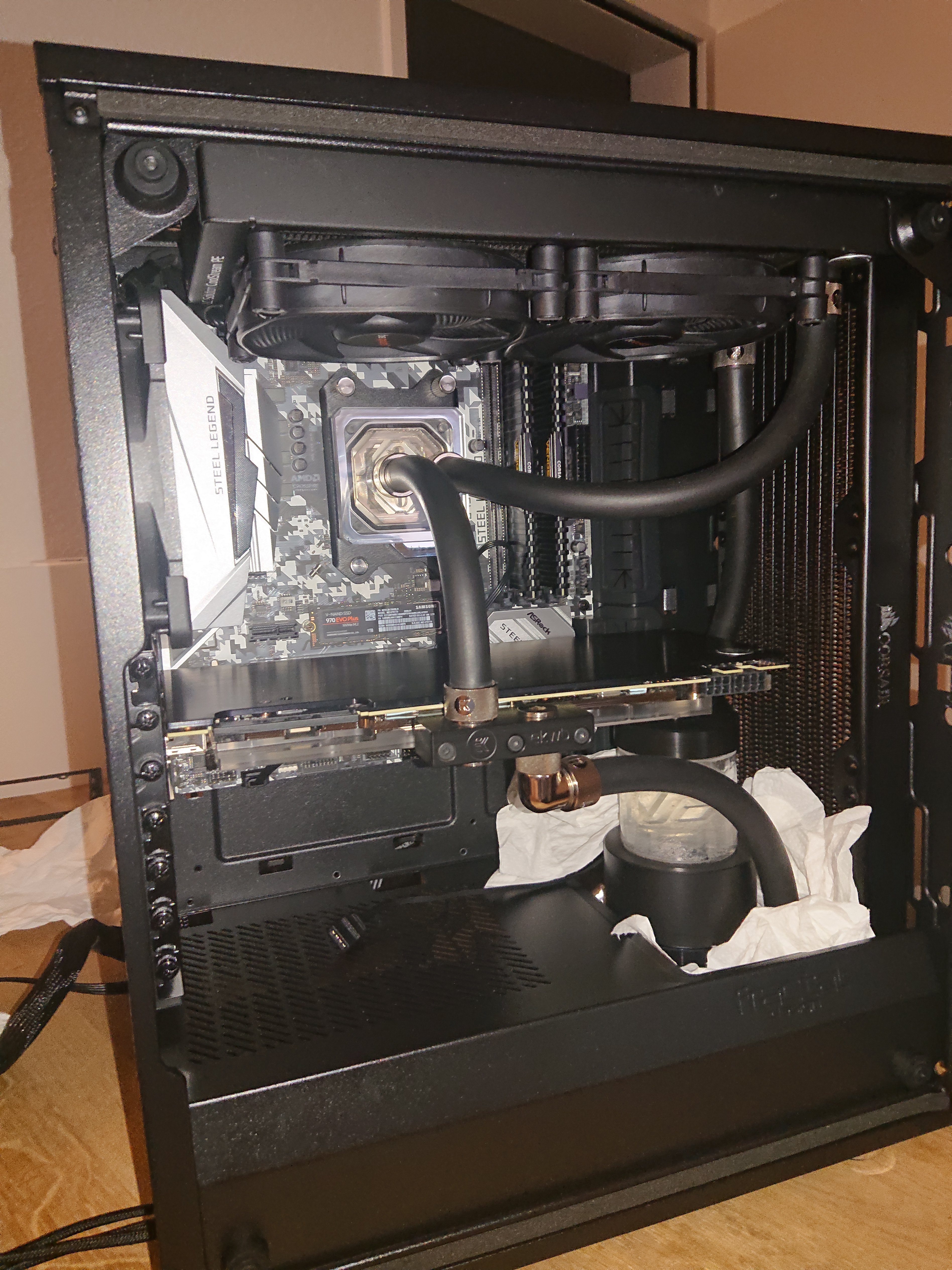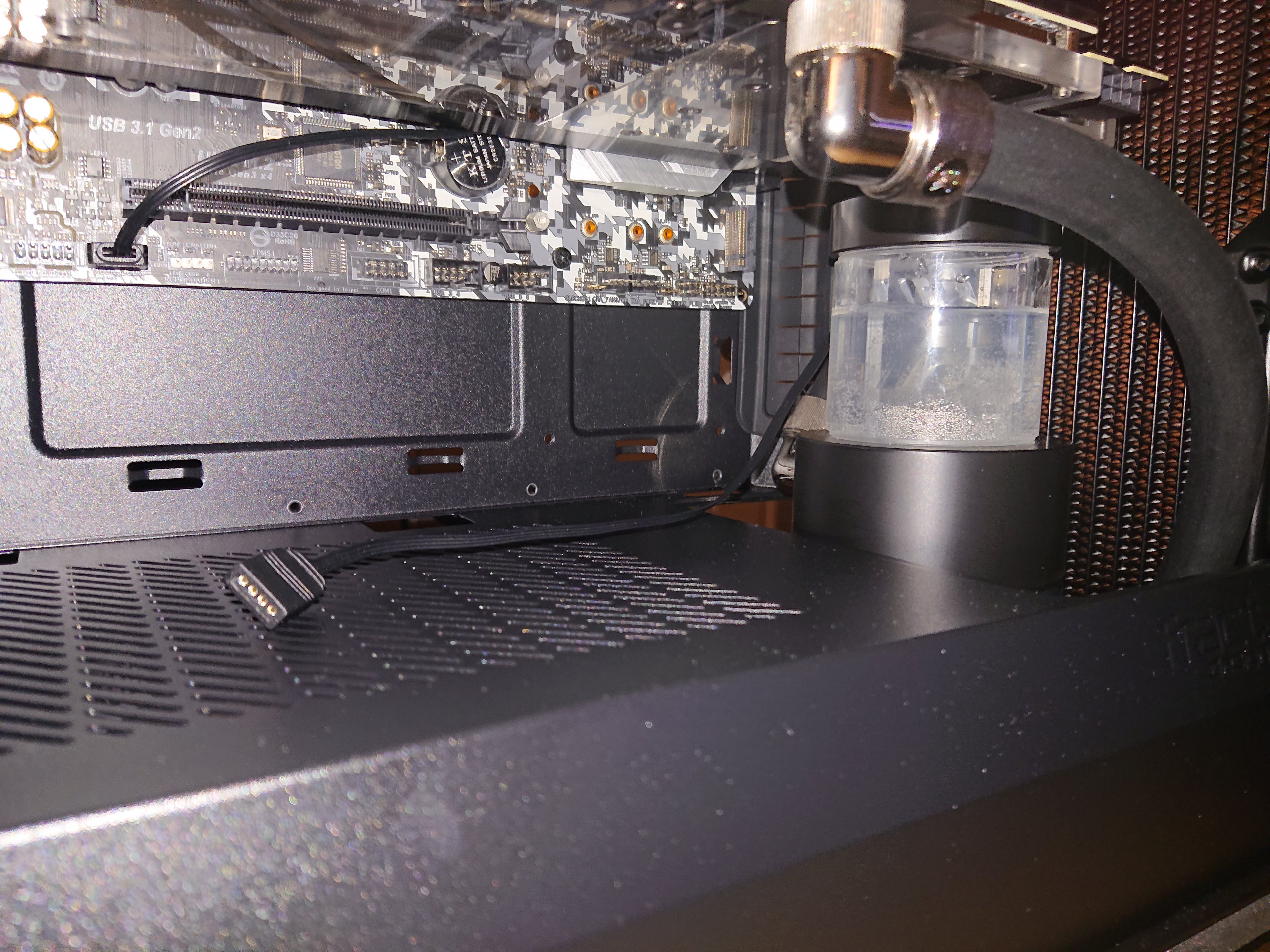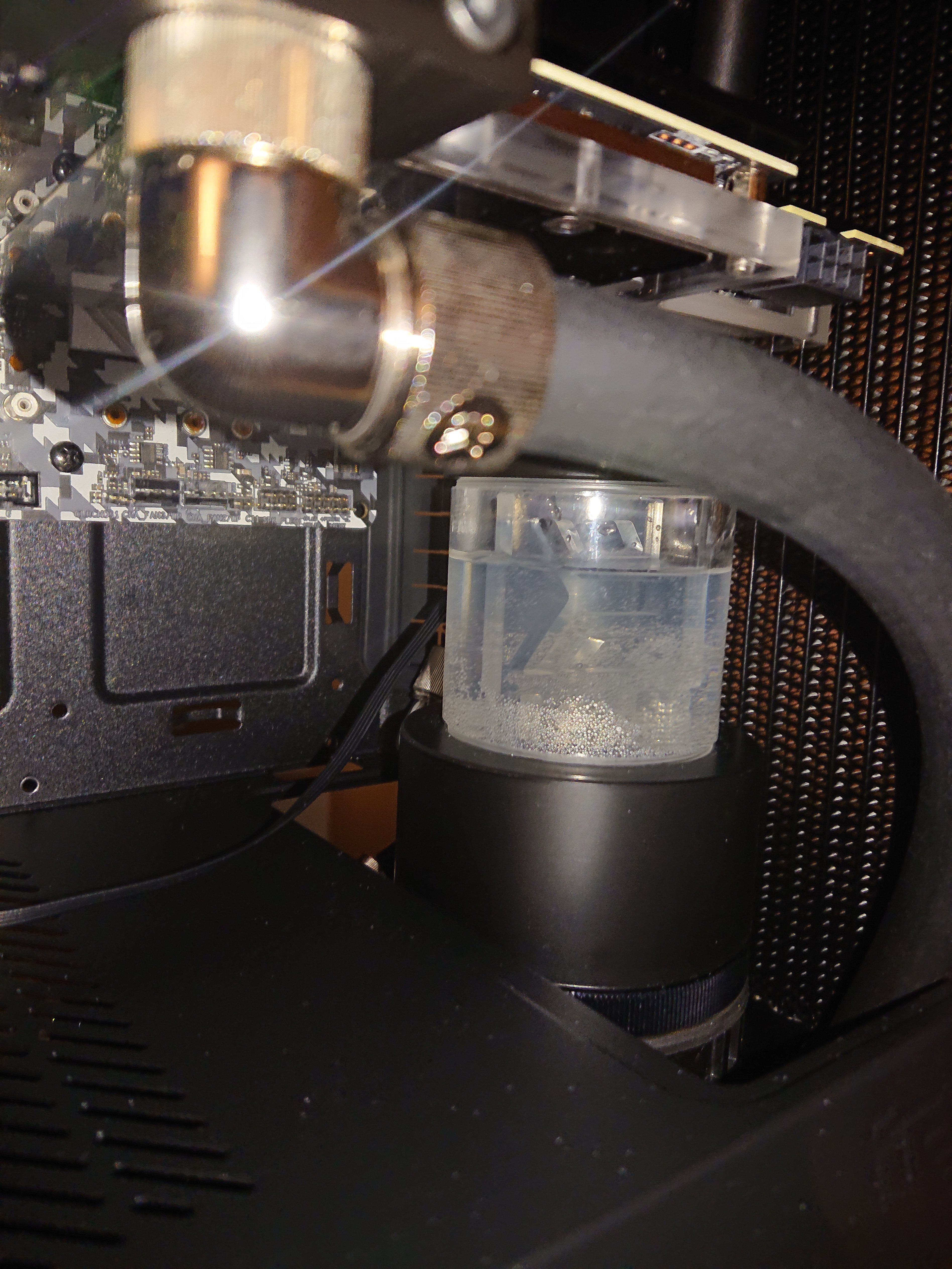 Da ich beim alten Build Probleme mit Ablagerungen hatte, habe ich beim neuen Loop EK ZMT Schlauch verwendet. Ausserdem ist der Corsair XR5 neu. Dieser wurde natürlich vor dem Einbau gründlich gespült. genauso wie alle anderen Komponenten einzeln mit der Pumpe und destilliertem Wasser gespült wurden, bis kein Dreck mehr sichtbar war / heraus kam.