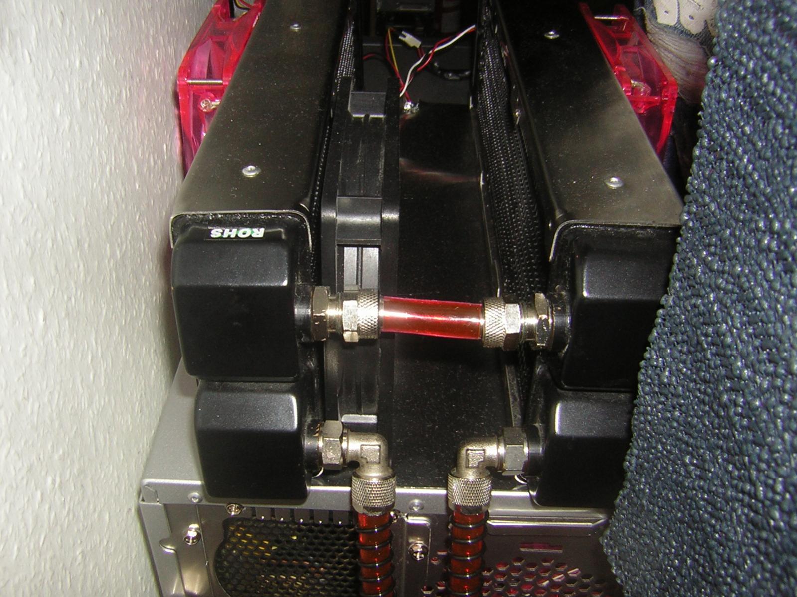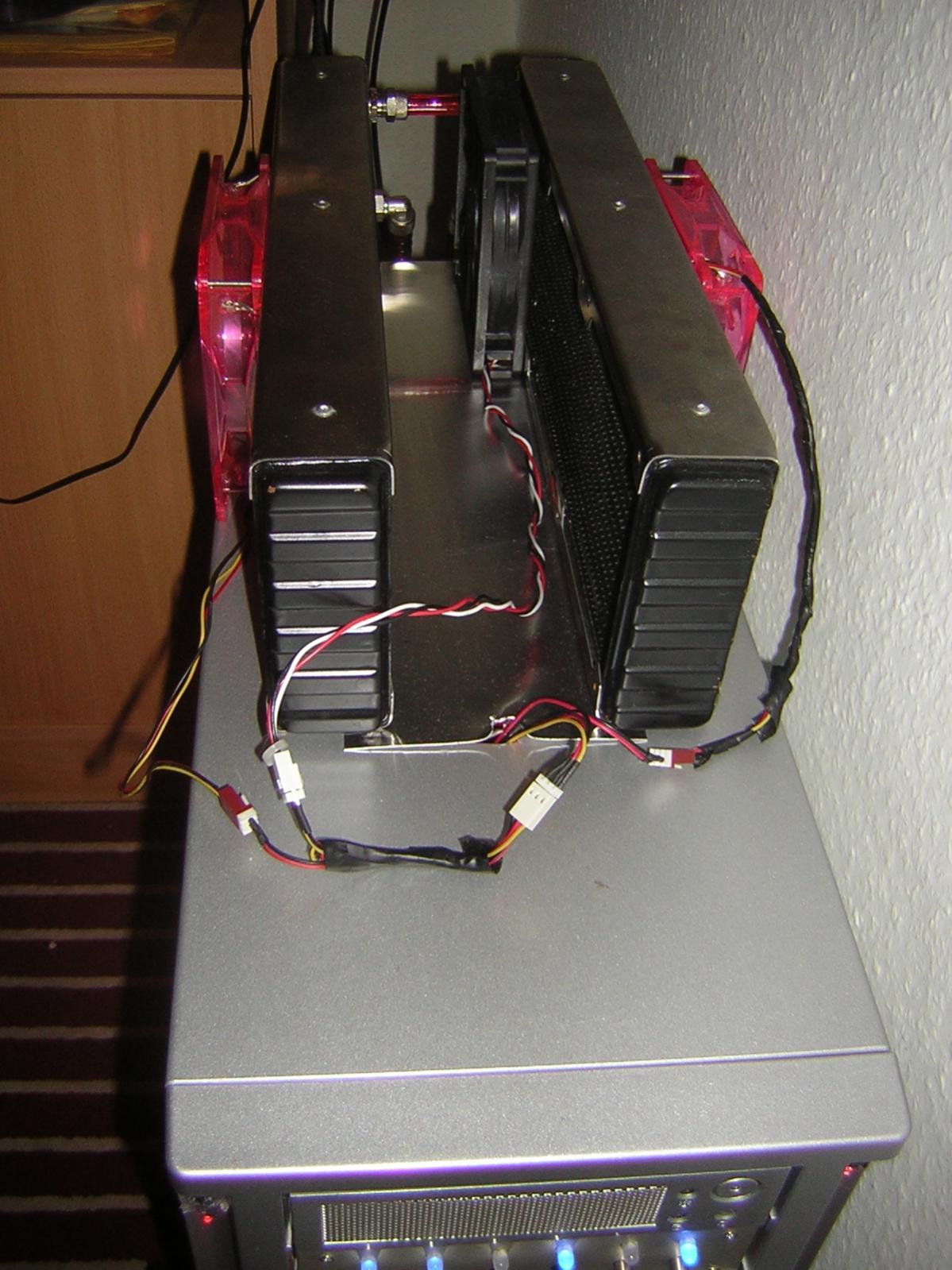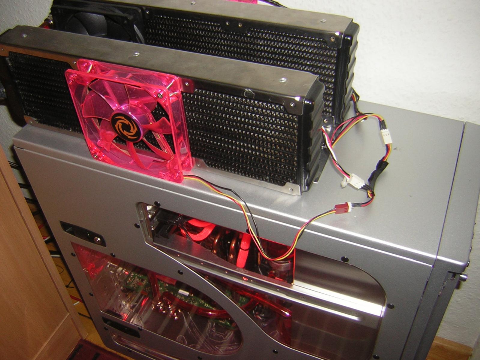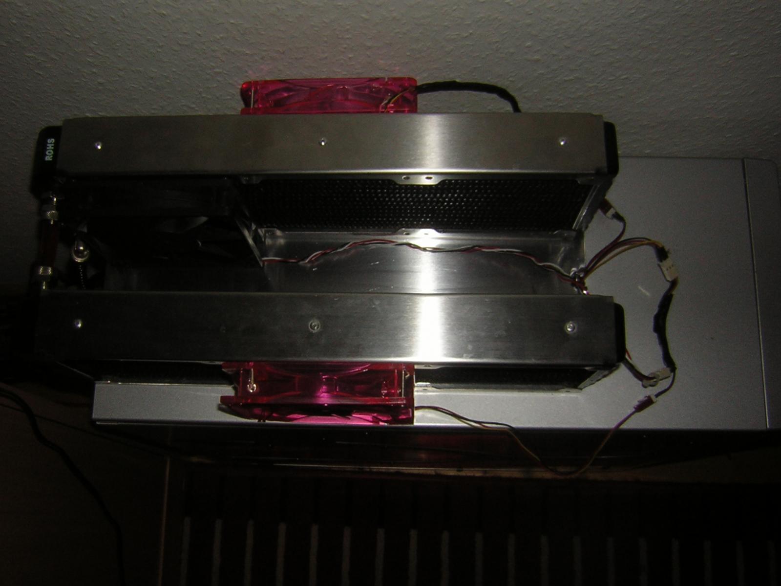 Der Einbau sieht dann so aus, nur das die Anschlüsse von den Radis sich hinten befinden. Will also keine Löcher ins Case bohren, obwohl ich die gehäusedurchführungs Anschlüsse auch hier liegen habe.