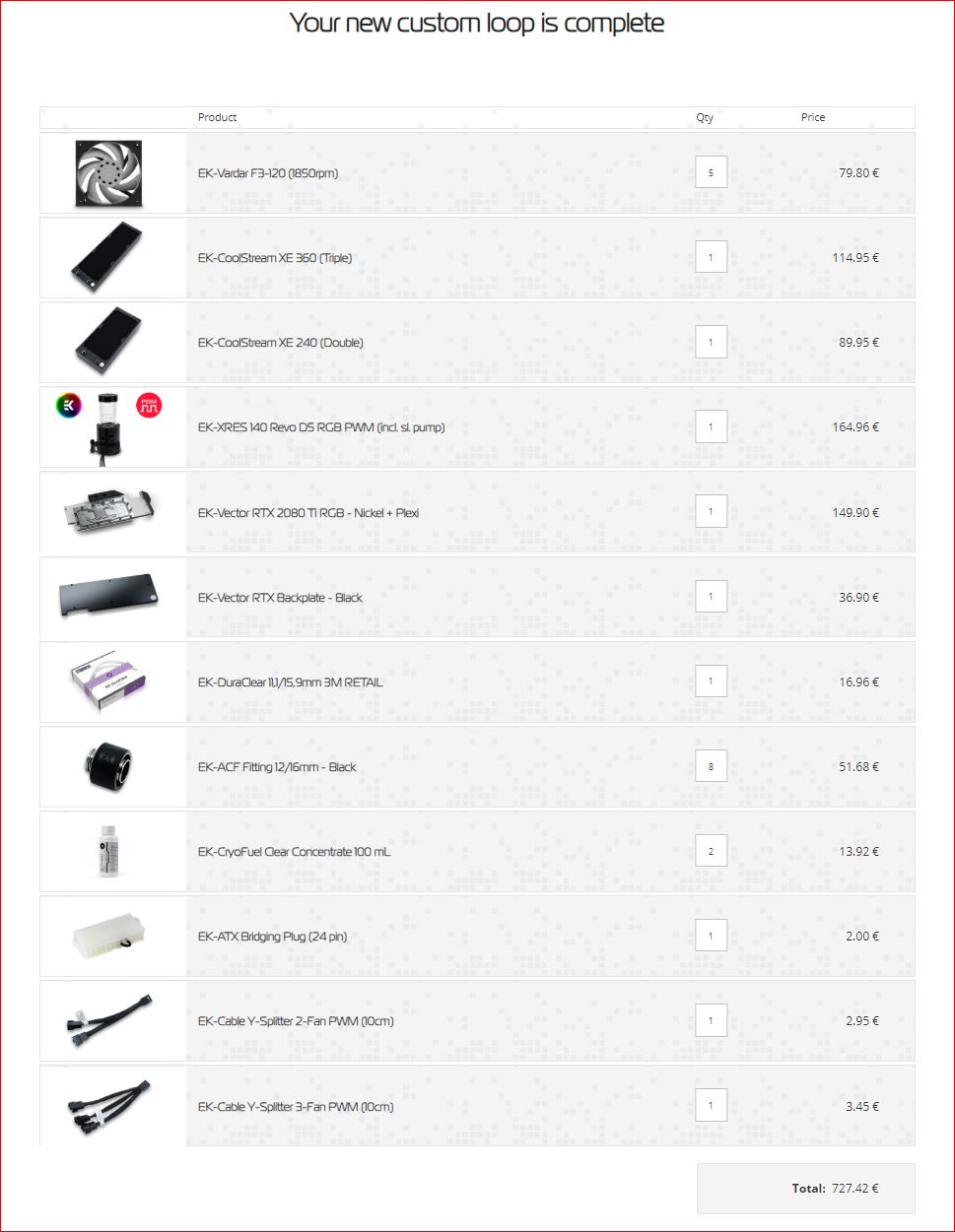 Zu mir: Ich habe von Wasserkühlung keine Ahnung und möchte mir auch nicht Stundenlang iwelche Anleitungen durchlesen. Deswegen habe ich mir auf der EKWB Seite von dem Konfigurator eine Liste erstellen lassen (siehe Bild)