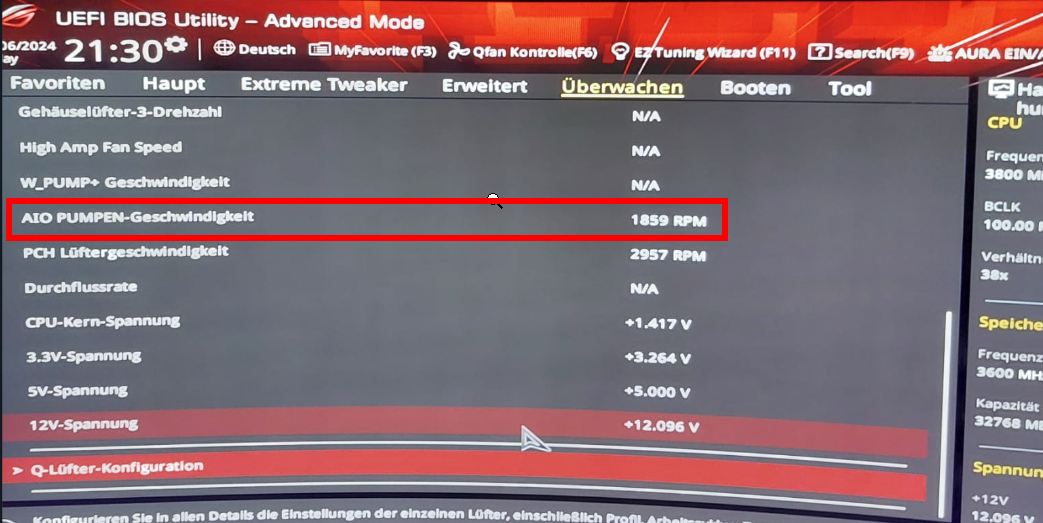 1. Drehzahl Wasserpumpe im Bios. Sie liegt bei 1859 Umdrehungen. Also ist die Pumpe schonmal okay.