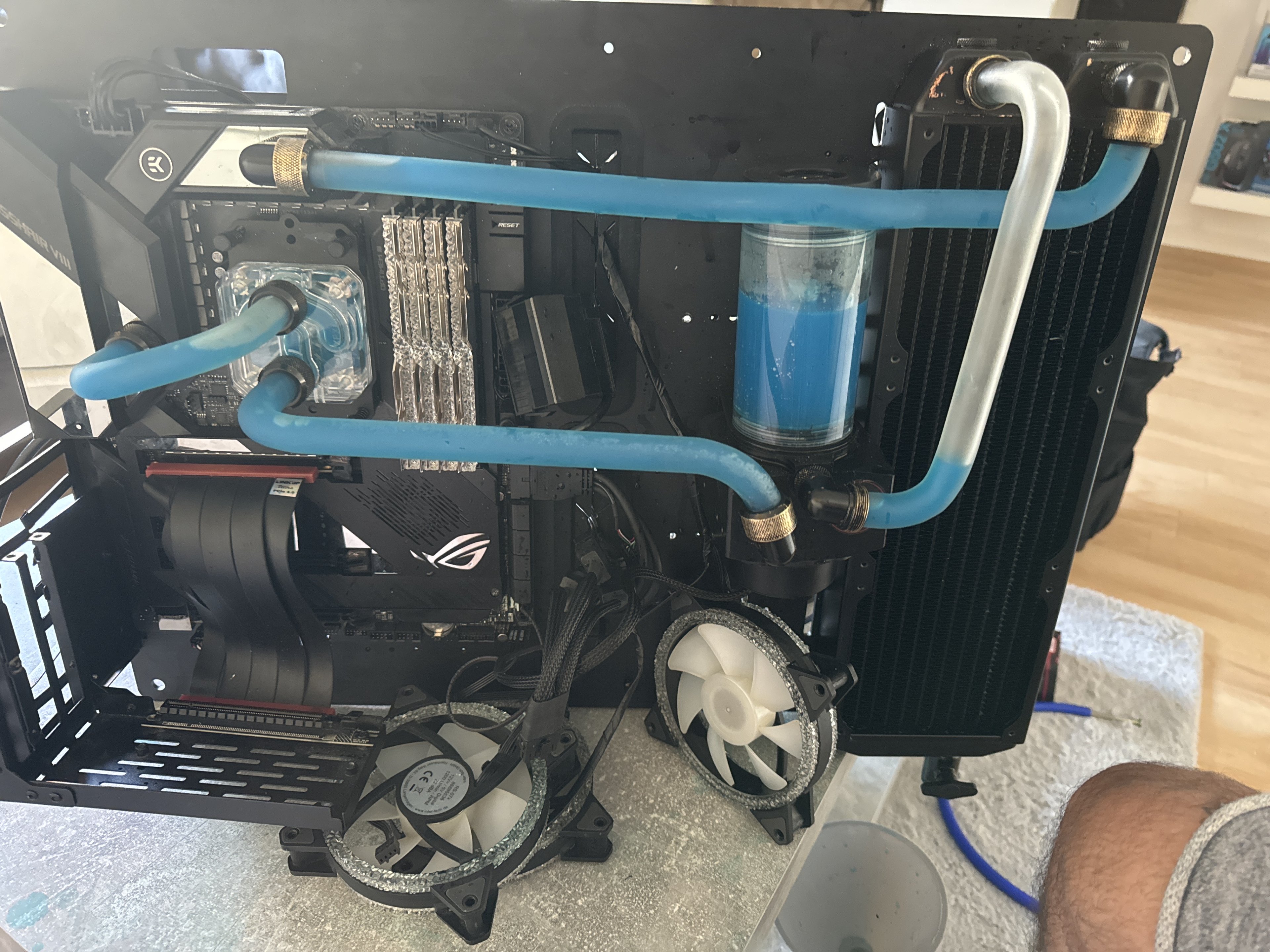 Auch die komisch blaue Kühlflüssigkeit ist nicht optimal. Diese Farbpatikel aus der Opaken Flüssigkeit setzten sich mit der Zeit irgendwo im Wasserkreislauf ab.