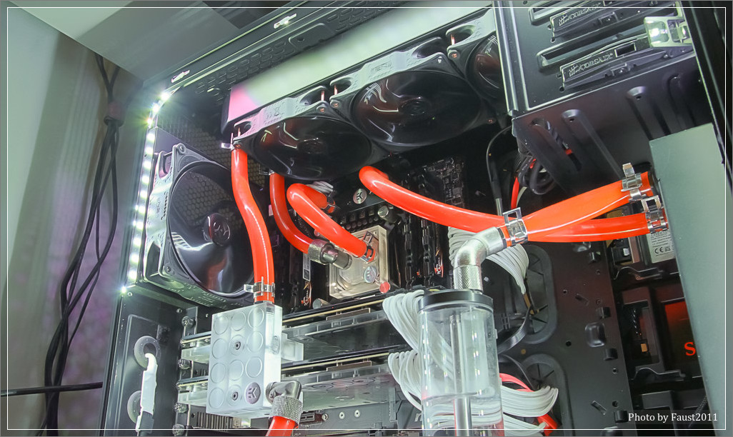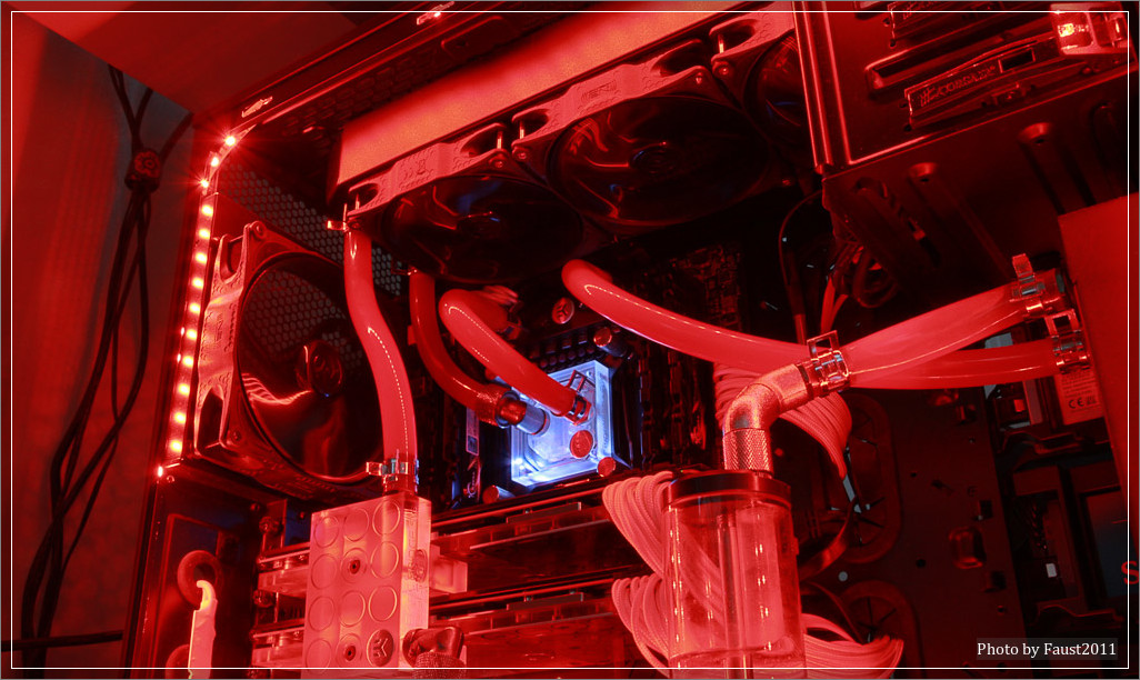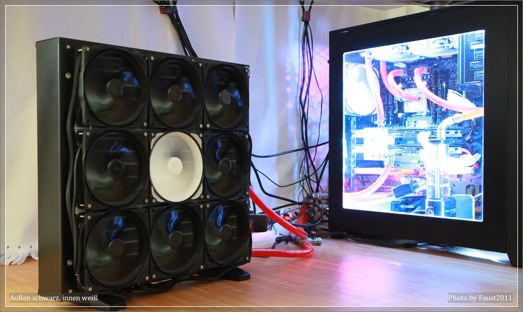 Meiner Meinung nach sind die Lüfter nun harmonischer ins Gesamtbild integriert, aber doch dominant in der Ausstrahlung, und das Rot der Schläuche kommt ein wenig kraftvoller zur Geltung.