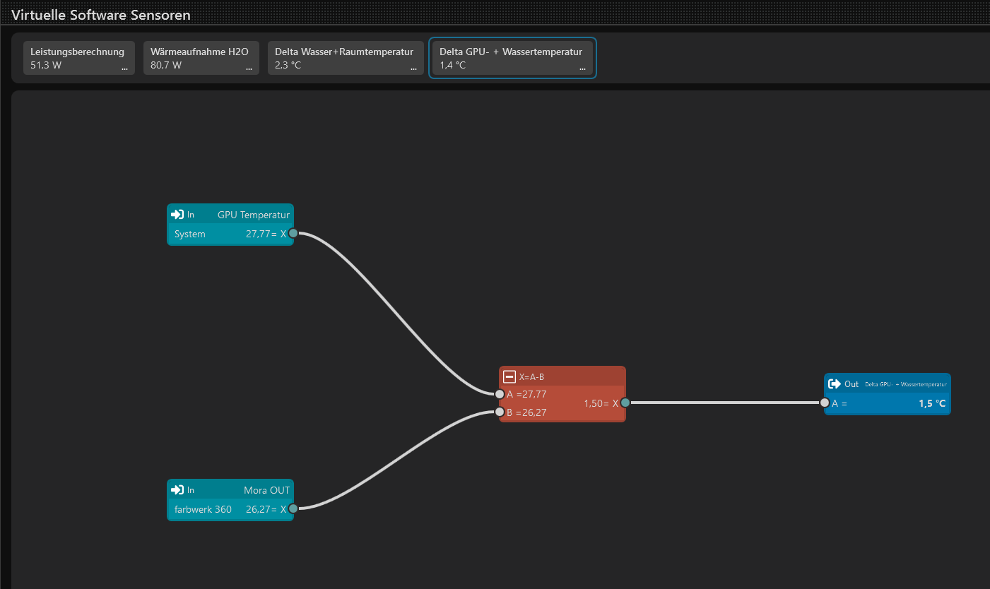 Wichtig für diese Messung ist ein Temperatursensor unmittelbar vor der Grafikkarte, damit auch die tatsächliche Temperatur hierzu aus dem Wasser ermittelt werden kann. Bringt daher nichts, wenn der Temperatursensor hierzu irgendwo im Loop nach oder vor einem Radiator sitzt oder gar nach der CPU.
