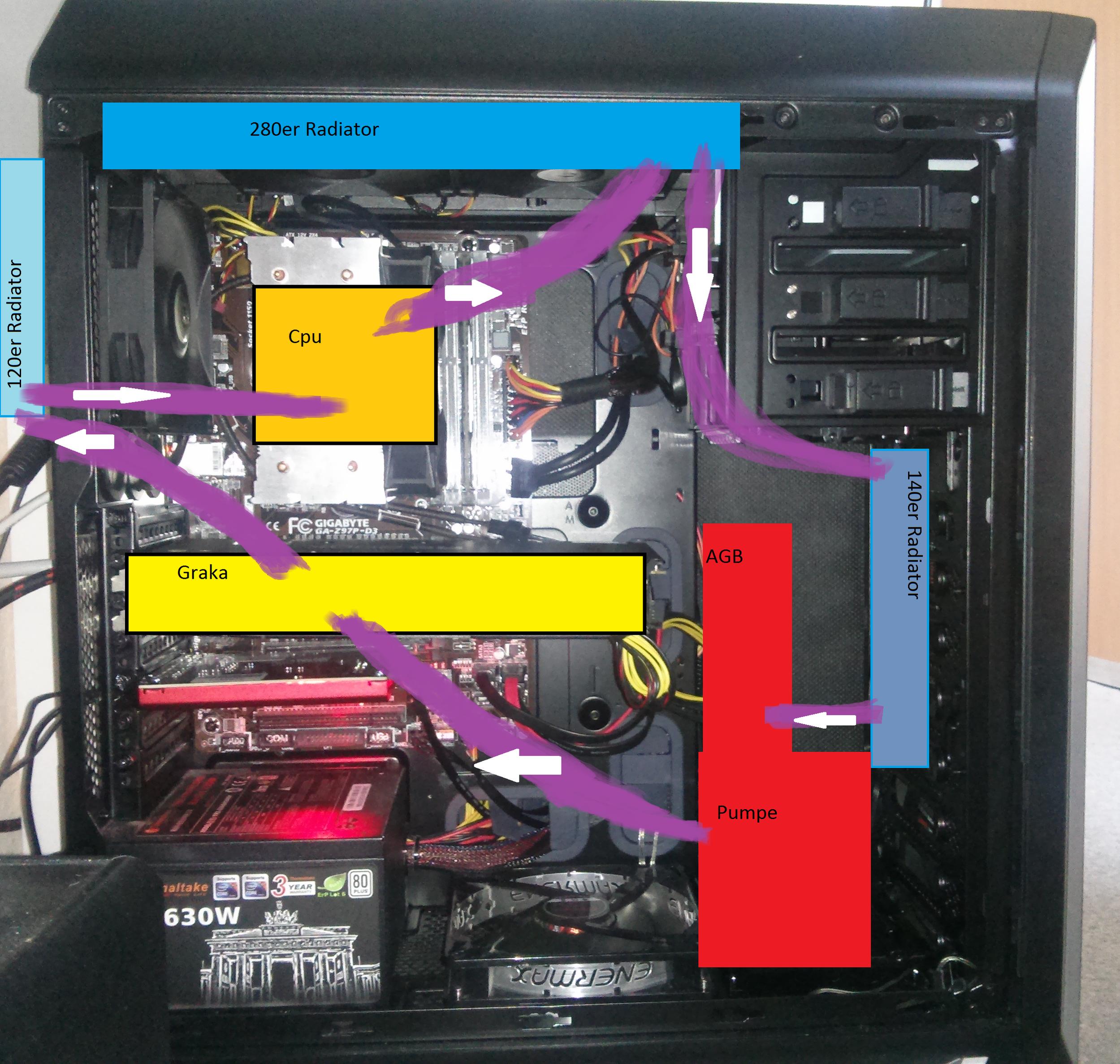 Ich hatte mir überlegt im Deckel einen 280er Slim radiator zu verbauen und hinten am Gehäuse noch einen 120er