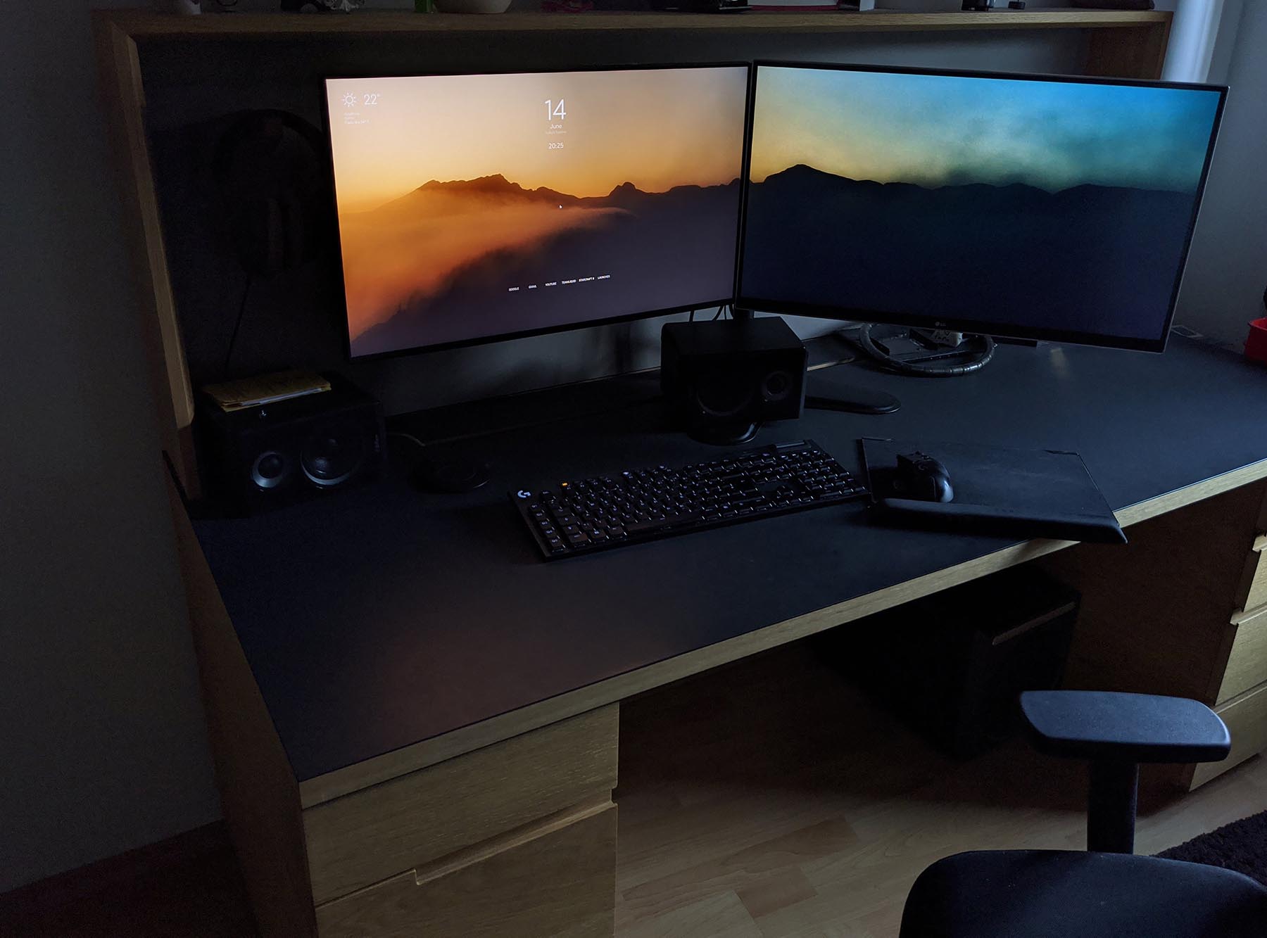 wie man den angehängten bildern entnehmen kann, ist mein pc unter dem schreibtisch verbaut. einerseits ist er dadurch leiser, andererseits entsteht ein gewisser wärmestau. mein schreiner hat mir extra unter und hinter dem rechner größere auschnitte in das reingefräßt , damit zumindest etwas luft zirkulieren kann. desweiteren ist seitlich eine offene tür mit lamellen angebracht, um gut an die kabel zu kommen.