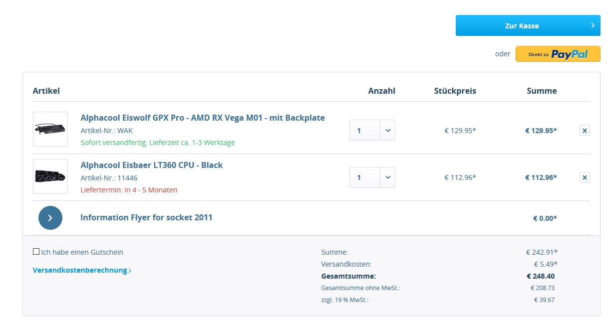 ich hab mir die Tage mal eine neue Grafikkarte ( MSI Radeon RX Vega56 AirBoost 8G OC ) gegönnt und nachdem ich festgestellt habe, dass die Luftsteuerung echt miserabel von den dingern ist, habe ich über eine Wasserkühlung von Alphacool nachgedacht.