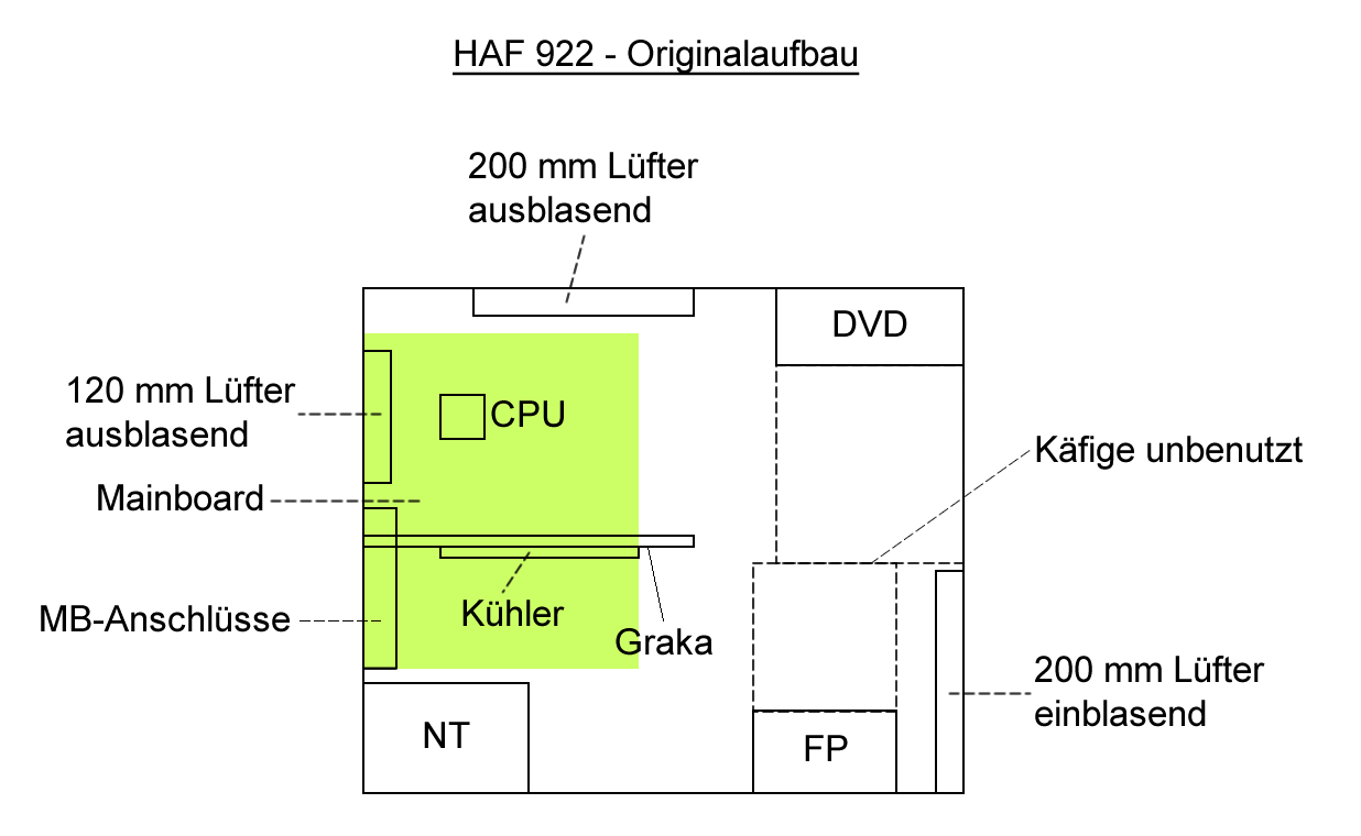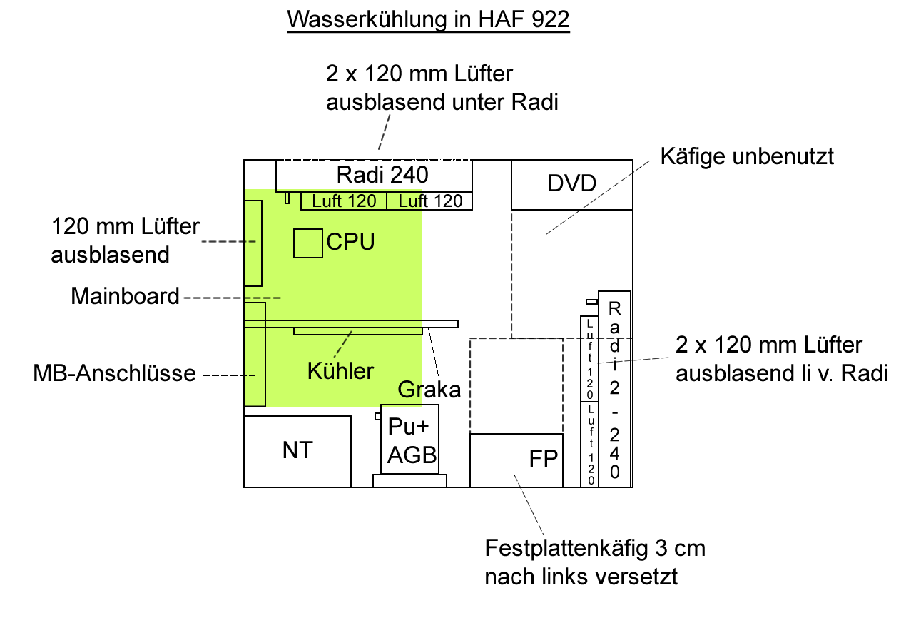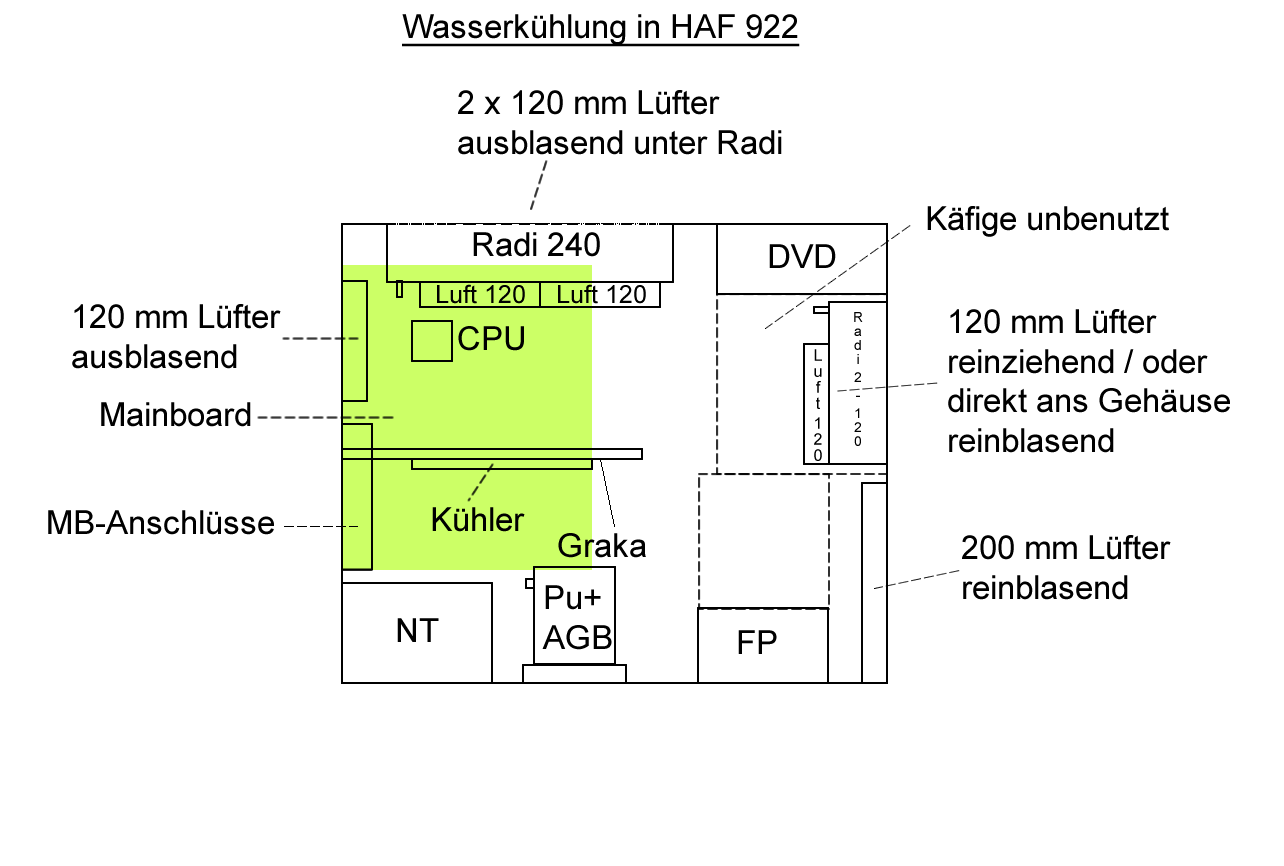 Zwar bekomm ich den 240er oben und den 120er ans Heck nicht rein, da sich diese im Weg umgehen. Aber ich werde den 240er oben in den Gehäusedeckel einbauen und den 120er vorne in den 51/4"-Käfig, der passt da wunderbar rein, ohne große Umbaumaßnahmen. Laut Technik sollte der 120er dann auch ins Gehäuse blasen, genauso wie der 200er Lüfter darunter in der Gehäusefront, das wäre für die Temps egal, aber der Luftstrom würde passen, da er von vorn in einer Richtung kommt und nach hinten und oben wieder raus kann. (also vorn unten 200er rein, vorn darüber 120er rein, hinten oben 120er raus, Gehäusedeckel 2 x 120er raus)