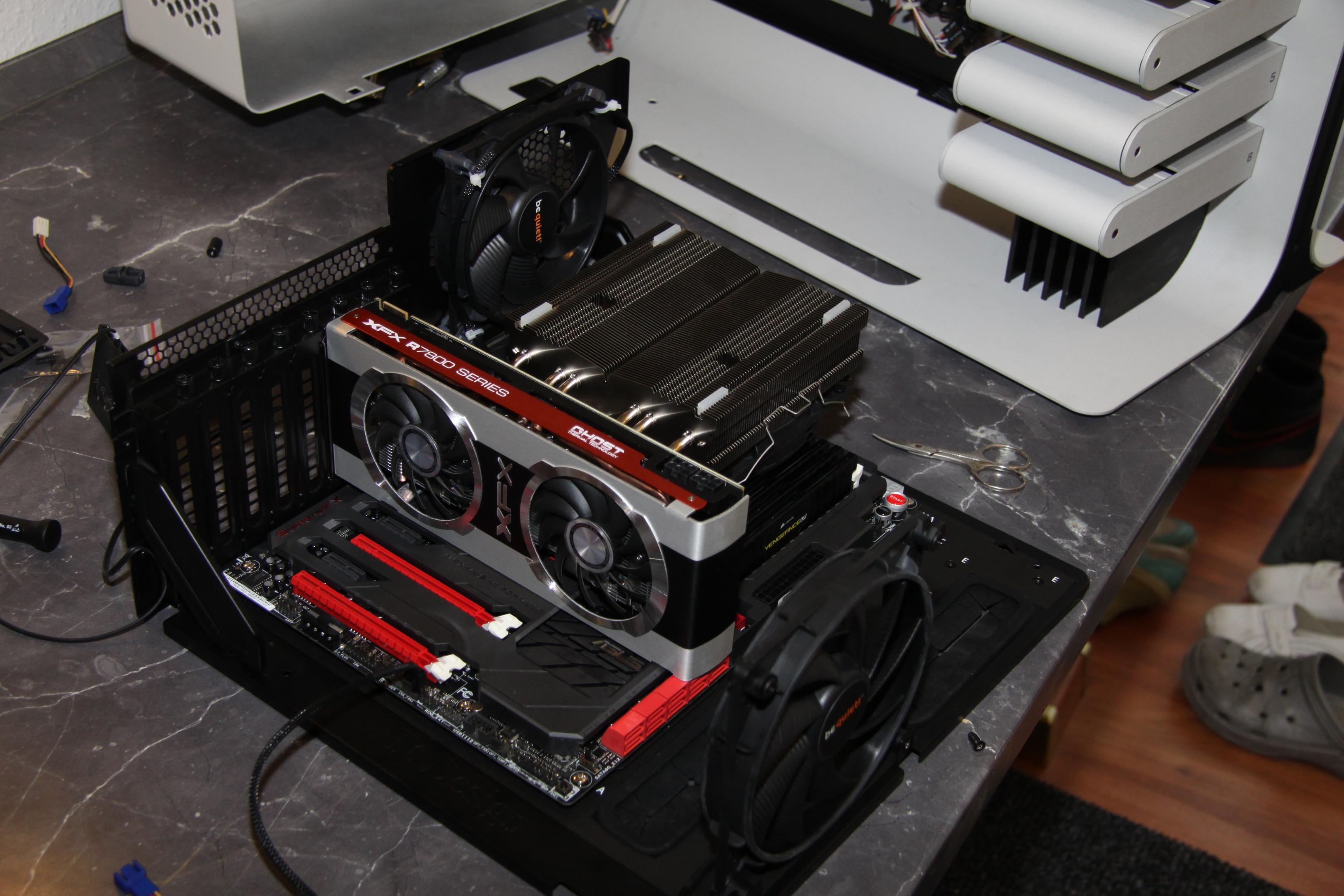Wärmetauscher mit mehr Abstand, sodass du nur einen Kreislauf hast und relativ viel Abstand (der hier abgebildete ist nur ein Bespiel). So könnte, würde man ihn so montieren, die warme Luft nach oben steigen und dann in den großen Tank den du machen willst rein. Ein 120er Lüfter @5V ist unhörbar und im Notfall einschaltbar, wobei bei der Menge an Litern, die du in einem Tank fassen willst fast schon vernachlässigbar ist.