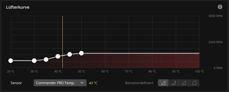 Der Sollwert als Einstellung ist nicht zwingend die beste Lösung. Klar, für meinen Fall ist das schon so. Das hat auch Gründe. Ein interner 420er, der etwas stromhungrige Hardware kühlen muss. Noch sind ja keine Moras dran. Dafür ist der Sollwert ganz gut. Für mehr als Idle oder leichte Last ist der interne Radi eh nicht zu gebrauchen, nicht bei der Hardware. Noch habe ich das System ja kaum ausgelastet und für den gelangweilten Idle-Betrieb haut das schon hin, weil ich so die Sicherheit nach oben habe. Bei den Moras werde ich auch nicht nach Sollwert, sondern nach Kurve regeln. Das ist zweckmäßiger.