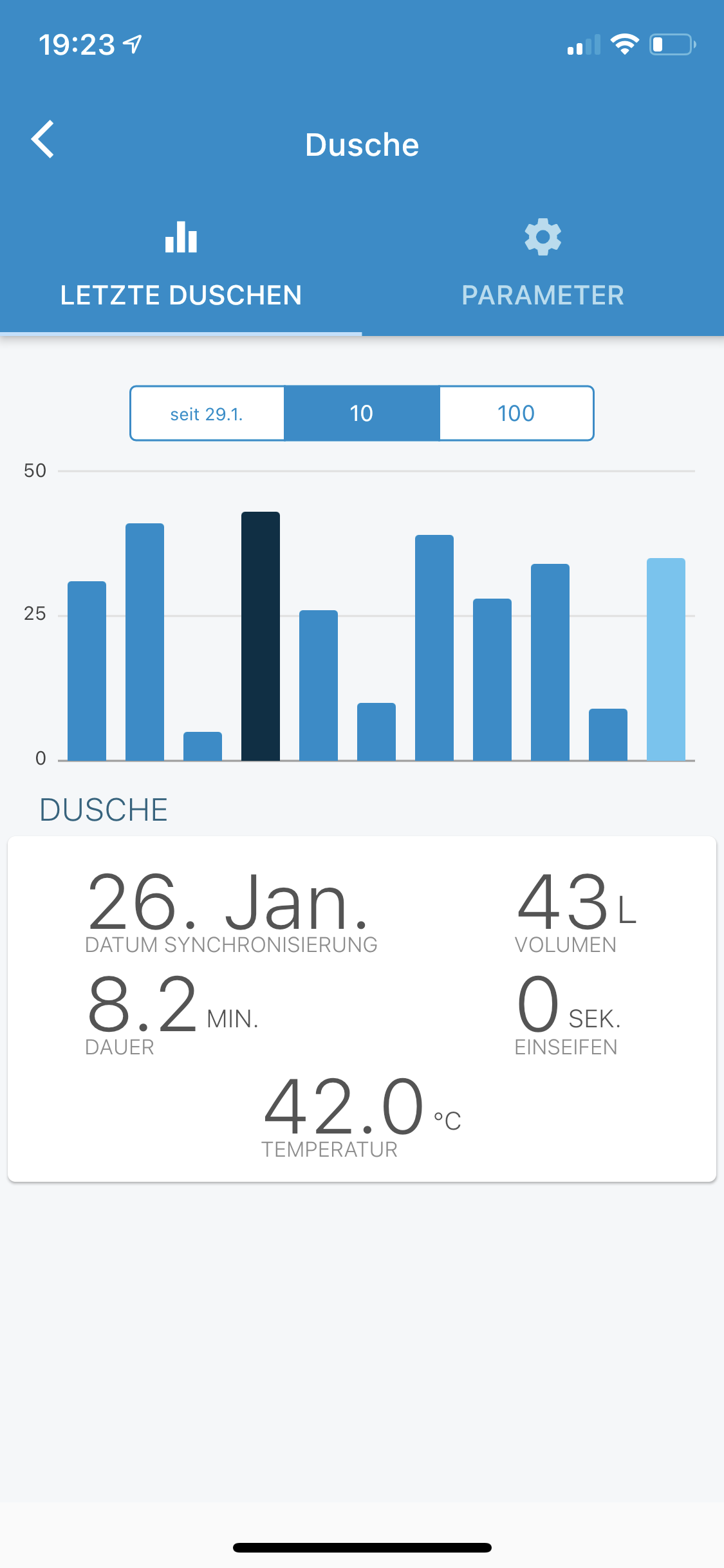 Ebenfalls kann man an den einzelnen Duschvorgängen sehen, wann dieser war und wie lange er gedauert hat. Toll für so kleine Statistikfreunde wie mich.