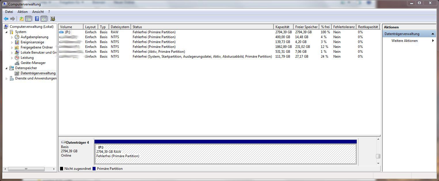 Testdisk sieht auch nur eine 750GiB HDD. Die Windows 7 (x64) Datenträgerverwaltung zeigt mir aber weiterhin die vollen 2794,39GB an - nur eben als RAW.