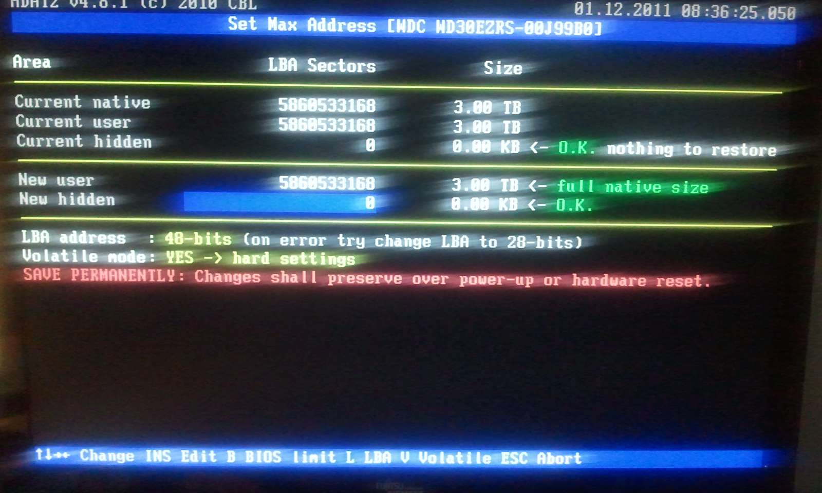 Ich starte es, wähle die HDD aus (da noch als 800GB angezeigt) sage dann Restore Capacity, wähle 3000GB aus, Warnhinweis, PowerOff.