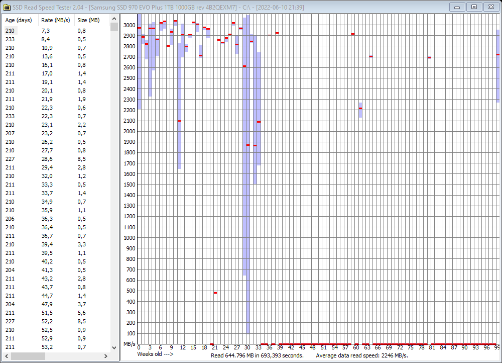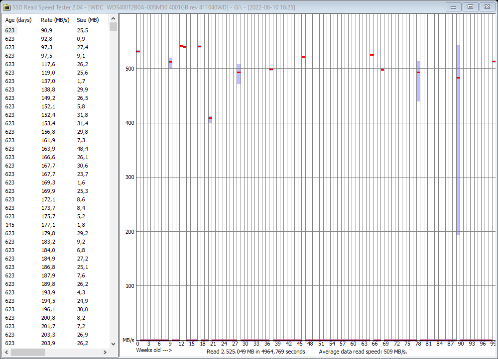 Da sich bei mir nur ein paar wenige Dateien langsam (10 von gut 16000 Dateien mit 90-150 MB/s) lesen lassen, ist mir das erst einmal egal. Ein Backup der Daten gibt es sowieso, falls irgendwann eine Datei nicht mehr lesbar sein sollten. Leider liefert das Tool nur eine einzige Zahl für jede Daten, was bei einer 2TB Datei recht ungenau ist.