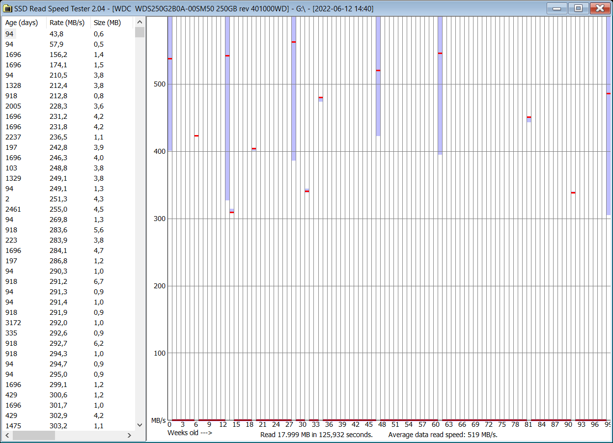 Schau Dir einfach die Screenshots an. Ganz links steht das Alter der Dateien (vermutlich das Erstellungsdatum gemäß Dateisystem, es muss also weder für die gesamte Datei stimmen noch muss es das Datum sein, an dem die Datei real auf die SSD geschrieben wurde), danaben die Leserate und die Dateigröße.ThommyDD schrieb:Könnten diejenigen, die hier fleißig Screenshots posten, bitte auch dazu schreiben, wann sie ihr System aufgesetzt haben bzw. wann die Daten auf die SSD geschrieben wurden?