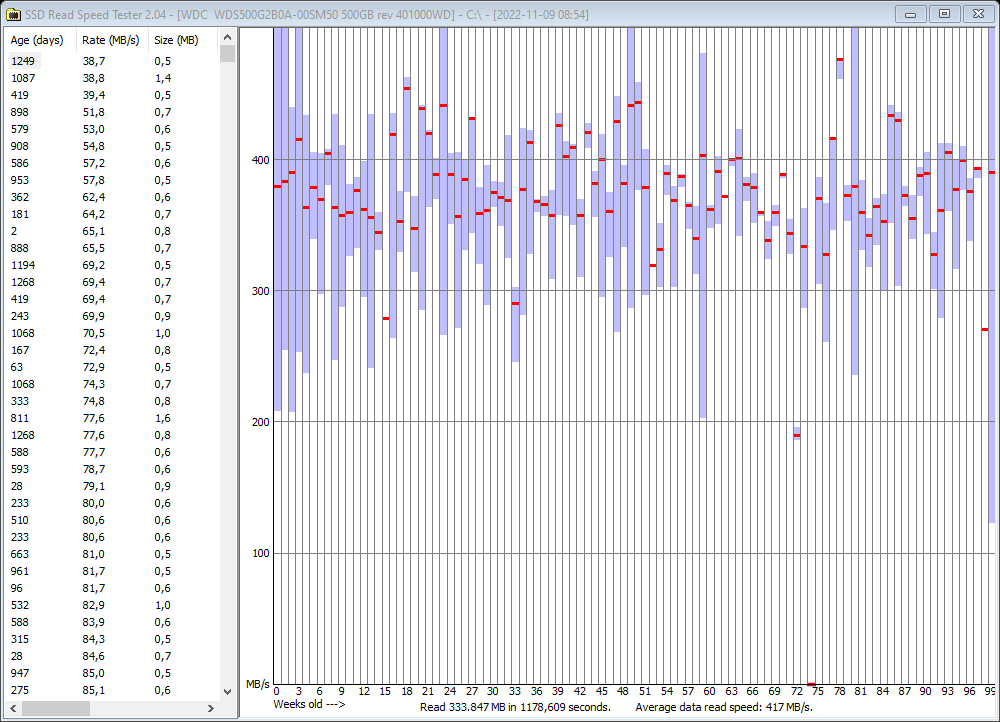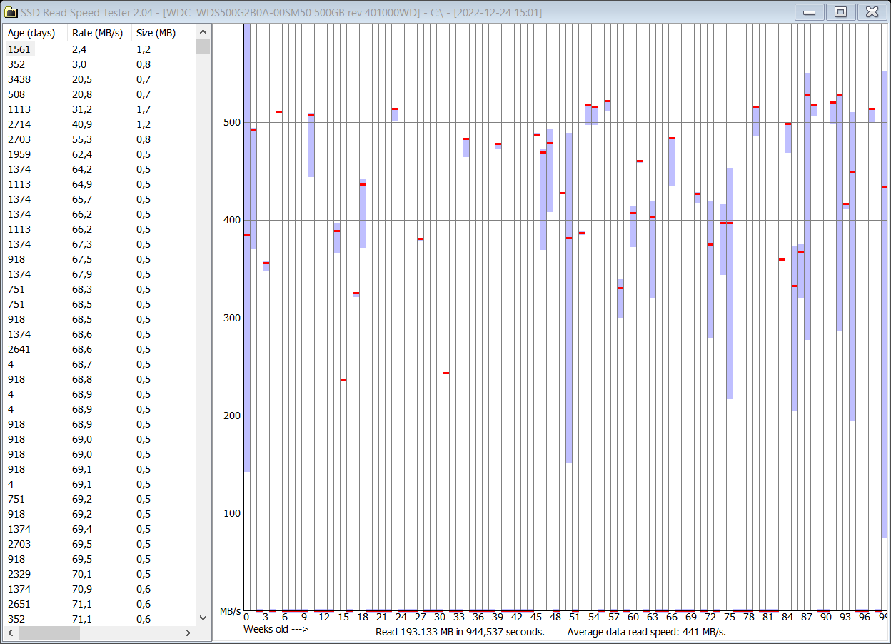 Na klar, das ist der bekannte Read-Disturb-Management-Bug bei den SATA-SanDisks. Den selben Verhalten haben die WD Blues auch. Ăber lange Zeit gespeicherte Daten "faulen" so zu sagen und werden langsamer lesbar - das betrifft aber alle SSDs. BloĂ die anderen schichten intern um und betreiben aktiv sog. Read Disturb Compensation. Genau da sind die WDs/SanDisks zu lazy/faul - einige Daten verweilen teilweise ĂŒber 1 Jahr an gleicher Stelle, werden nur noch mit 80-120MB/s gelesen (statt ~500MB/s) und man muss sie >>100 Mal lesen bis die SSD endlich realisiert "OK, hier muss ich wohl optimieren". D.h. diese Mechanismen sind bei den o.g. SSDs nicht gĂ€nzlich kaputt, sie sind da halt etwas lahm. Bei Dir mir den 4 MB/s ist wohl ein auĂerordentlicher Worstcase, so lahm habe ich das auch noch nie gesehen. Und Lese-Latenz auf HDD-Niveau!
