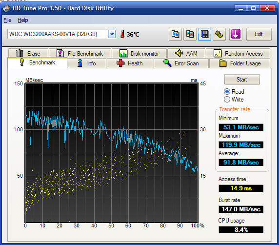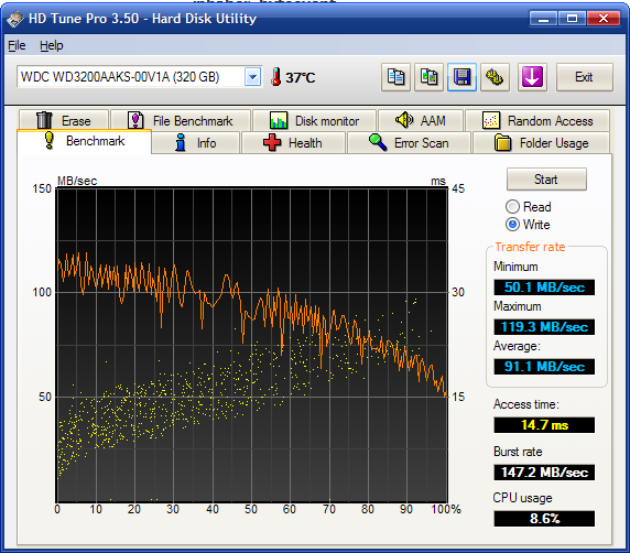 Mit HD Tune sind max. Leseraten bei rund 120MB/s und durchschnittliche Leseraten von ca. 92 MB/s gemessen wurde. Schreibwerte